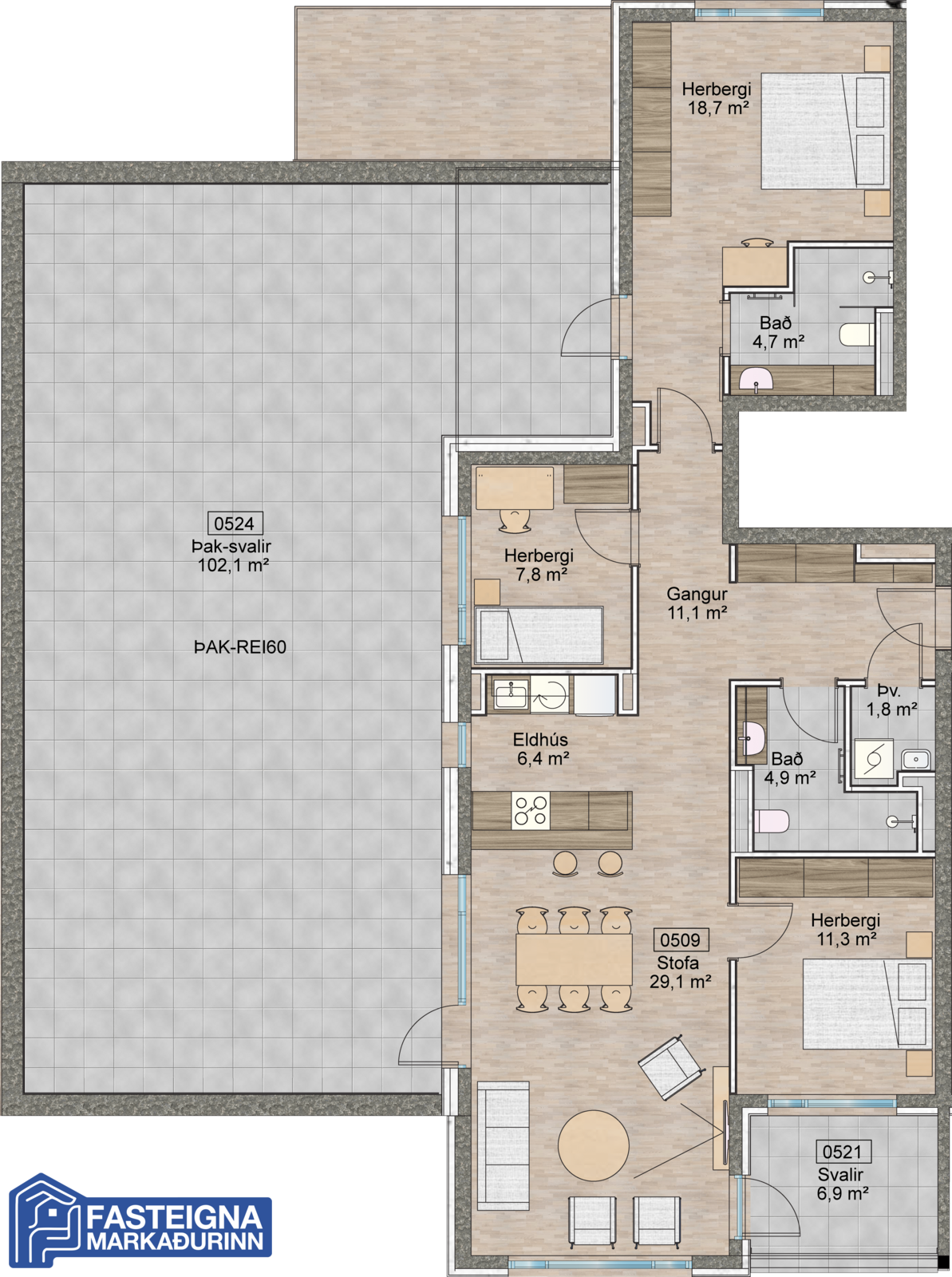 Fasteignamarkaðurinn ehf. sími 570-4500 kynnir til sölu glæsilega og vel skipulagða 4ra herbergja íbúð á 5. og efstu hæð, íbúð 0509, í 6. hæða nýbyggðu lyftuhúsi á frábærum stað við Bolholt 7-9 Reykjavík. Íbúðin er 125,5 fermetrar að stærð og þar af er geymsla 9,6 fermetrar. Útgengið er á 103,7 fermetra þaksvalir frá stofu og eru einnig aðrar minni 6,9 fermetrar. Bílastæði í upphitaðri bílageymlu merkt B-9 fylgir eigninni..