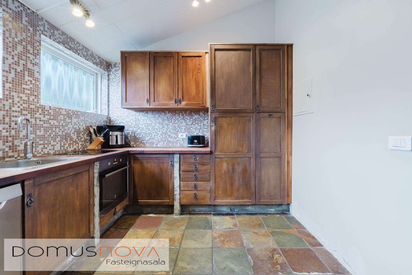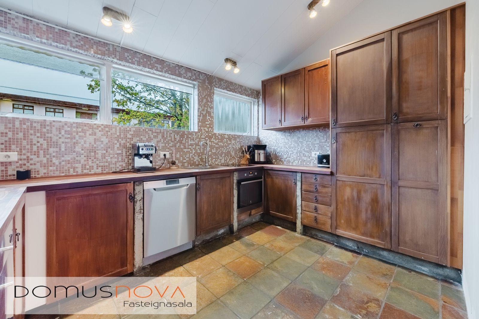 Eldhús með náttúruflísum á gólfi og rúmgóðri innréttingu, mósaík flísar eru á veggjum og milli efri og neðri skápa.
