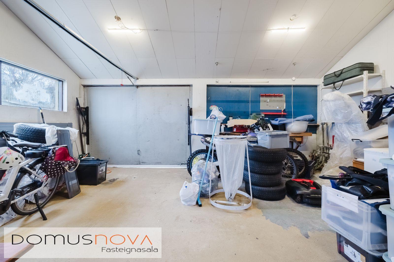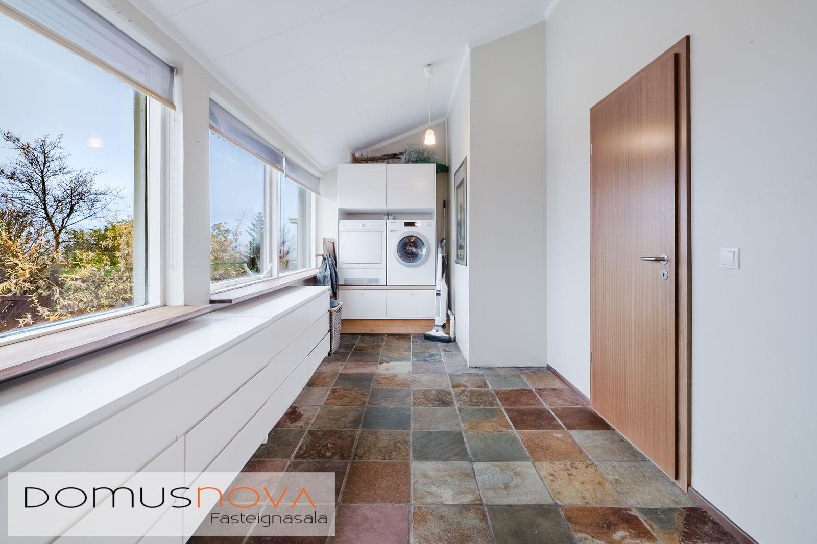Þvottahús er með náttúruflísum á gólfi, úr þvottahúsi er gengið í bílskúr, sem er með tveimur innkeyrsluhurðum.