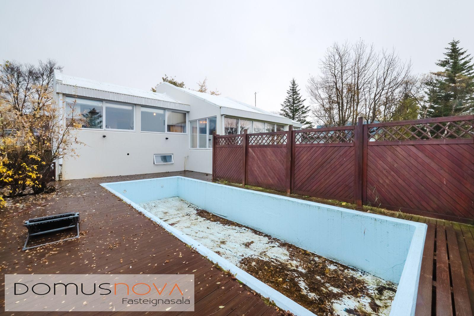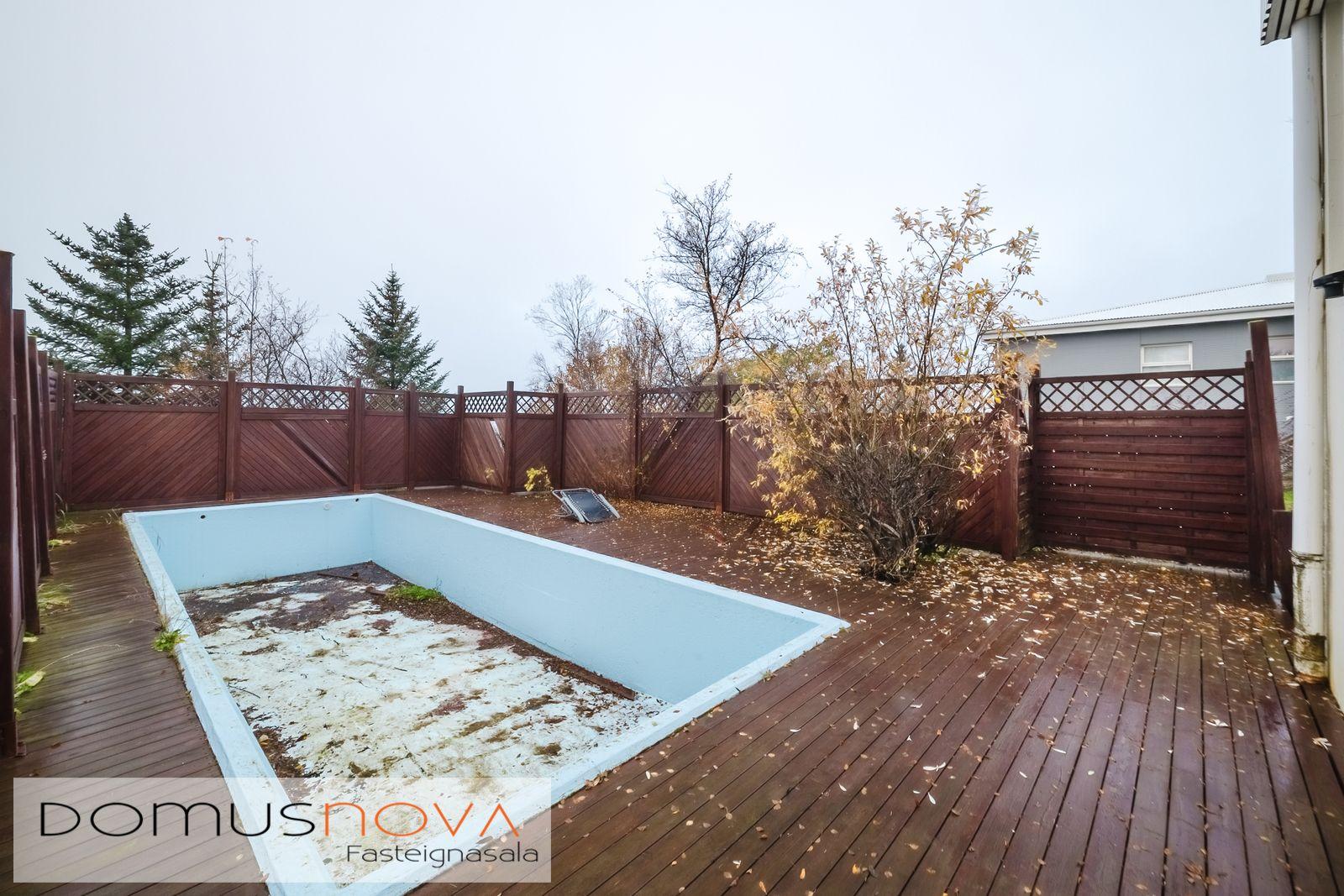 Úr stofunni er hurð út á sólpall. Á sólpalli er steinsteypt sundlaug.