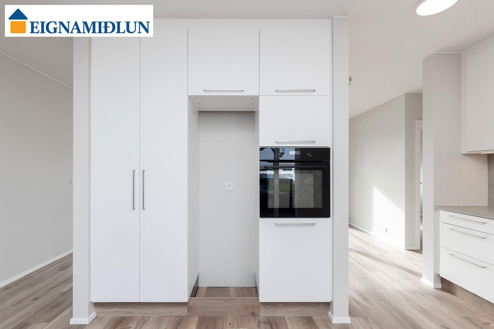 Eldhús: Eldhúsinnrétting með góðu skápaplássi frá Axis. Ofn í vinnuhæð, góð vinnuaðstaða.