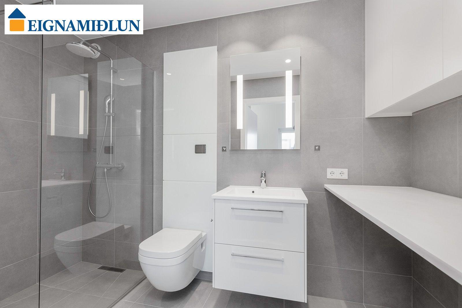 Baðherbergi: Baðherbergi með sturtuklefa. Handlaug, handklæðaofn og upphengt salerni. Flísar á gólfum og veggjum. Aðstaða fyrir þvottavél og þurrkara inn á baðherbergi.