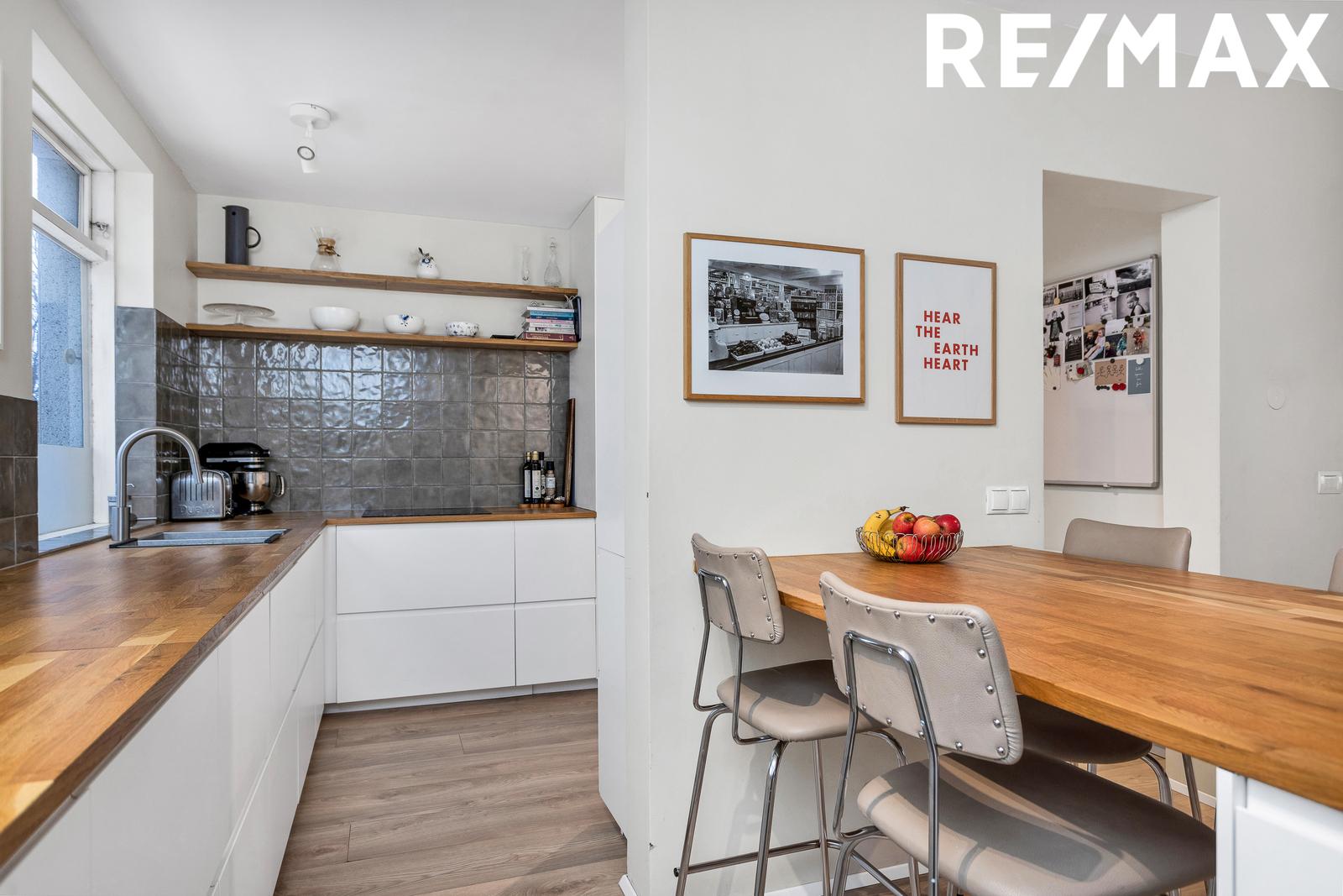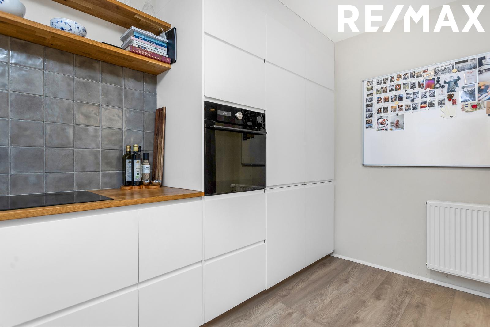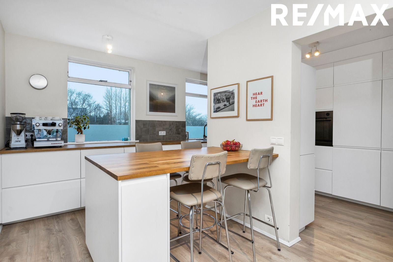 Eldhús og borðstofa er nú eitt og sama rýmið og hefur allt verið endurnýjað. Eldhúshinnrétting spannar nú yfir stærra svæði og þar sem eru efri skápar, ná þeir upp í loft. Innrétting er hvít og borðplötur úr við. Veggir eru að hluta flísalagðir. Ný tæki og innfelldur ísskpur, frystir og uppþvottavél. Einnig eru hyrslur undir háu eldhúsborði sem setið er við í háum stólum. Parket á gólfi flæðir einnig inn í stofu, svefnherbergisgang og herbergi.