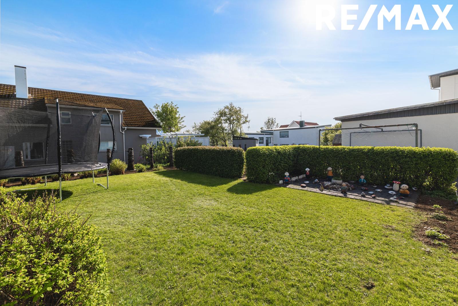 Garður er snyrtilegur og hefur verið vel við haldið. Að hluta til er grasflötur, að hluta hellulögn og eru matjurtarreitir afmarkaðir með kvistum. Einnig eru snúrustaurar. Frá því myndir voru teknar er búið að endurnýja handrið upp tröppur og mála steypta fleti á húsinu að utan.
