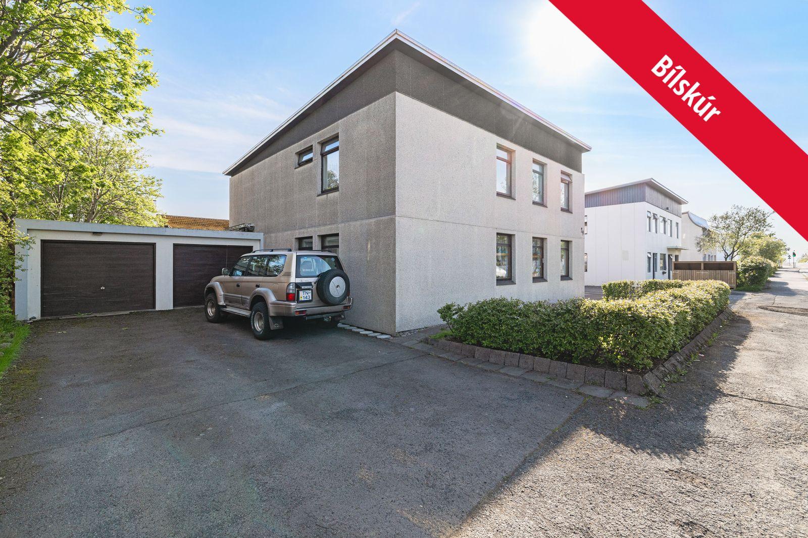 Bílskúr er skv. Þjóðskráryfirliti 23,1 m2 (birt flatarmál). Sjálfvirkur bílskúrshurðaopnari. Opið er á milli bílskúrs efri og neðri hæðar. Gólf er steypt. Innst í bílskúr er sér afmarkað rými með gluggum út í garð. Framan við bílskúr er steypt bílaplan.