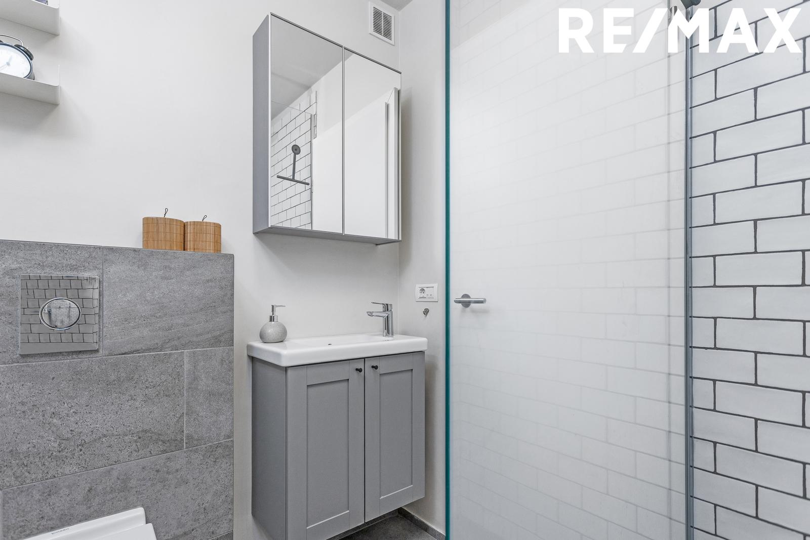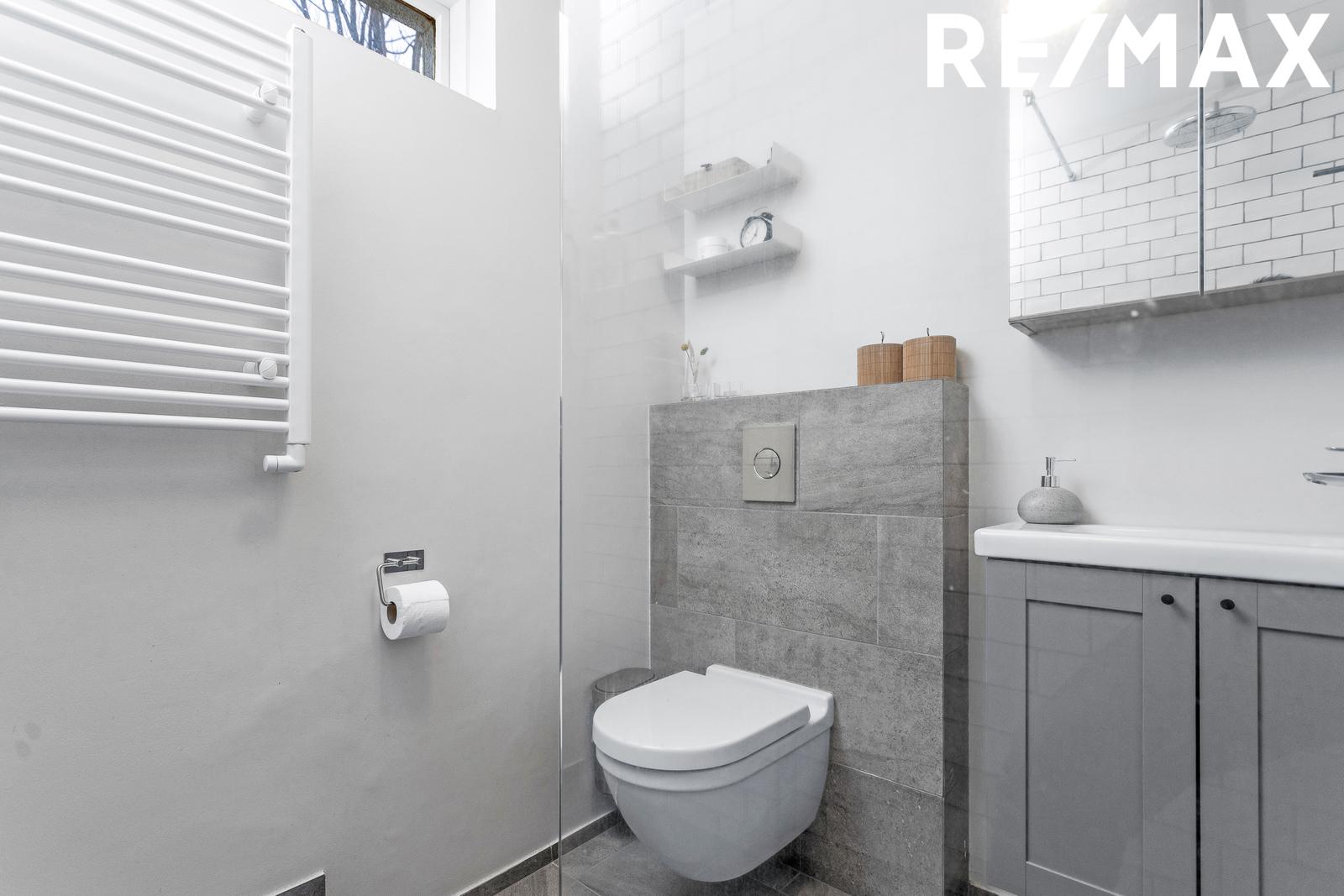 Baðherbergi var gert upp fyrir nokkrum árum. Upphengt salerni, grá innrétting undir handlaug, veggfestur skápur, sturta með glervegg og hvítur handklæðaofn. Gráar gólfflísar og upp salerniskassa. Hvítar veggflísar inni í sturtu. Gólfhiti.