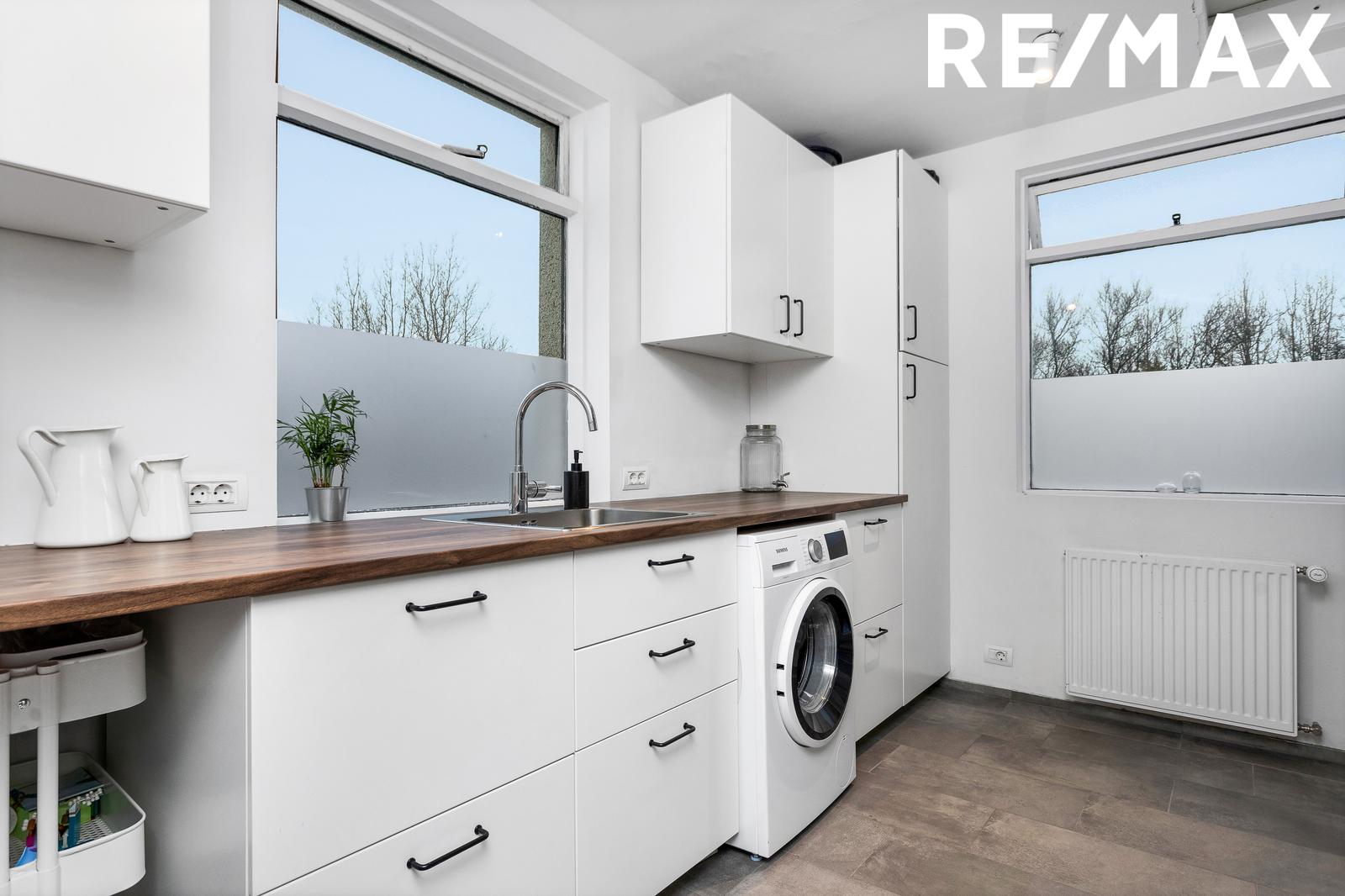 Þvottahús og geymsla er inn af forstofu og er nú eitt og sama rýmið. Nýleg innrétting á einum vegg með vaski og borðplötu. Á langvegg er opin skápaeining. Ljósar gólfflísar eins og í forstofu. Lúga er upp í þakrými.
