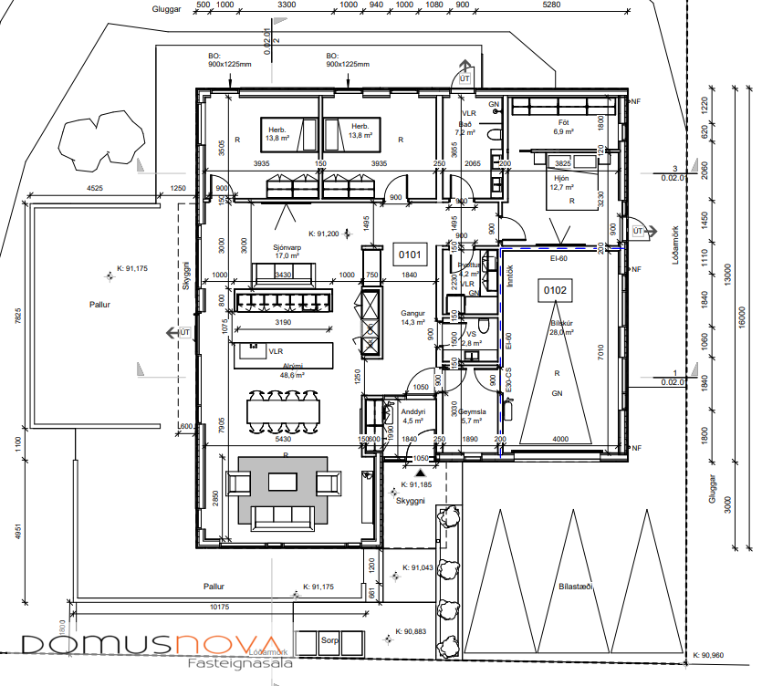 Einangrun:Botnplata er einangruð með 24kg/m3 100mm einangrunarplasti, veggir sökkla eru