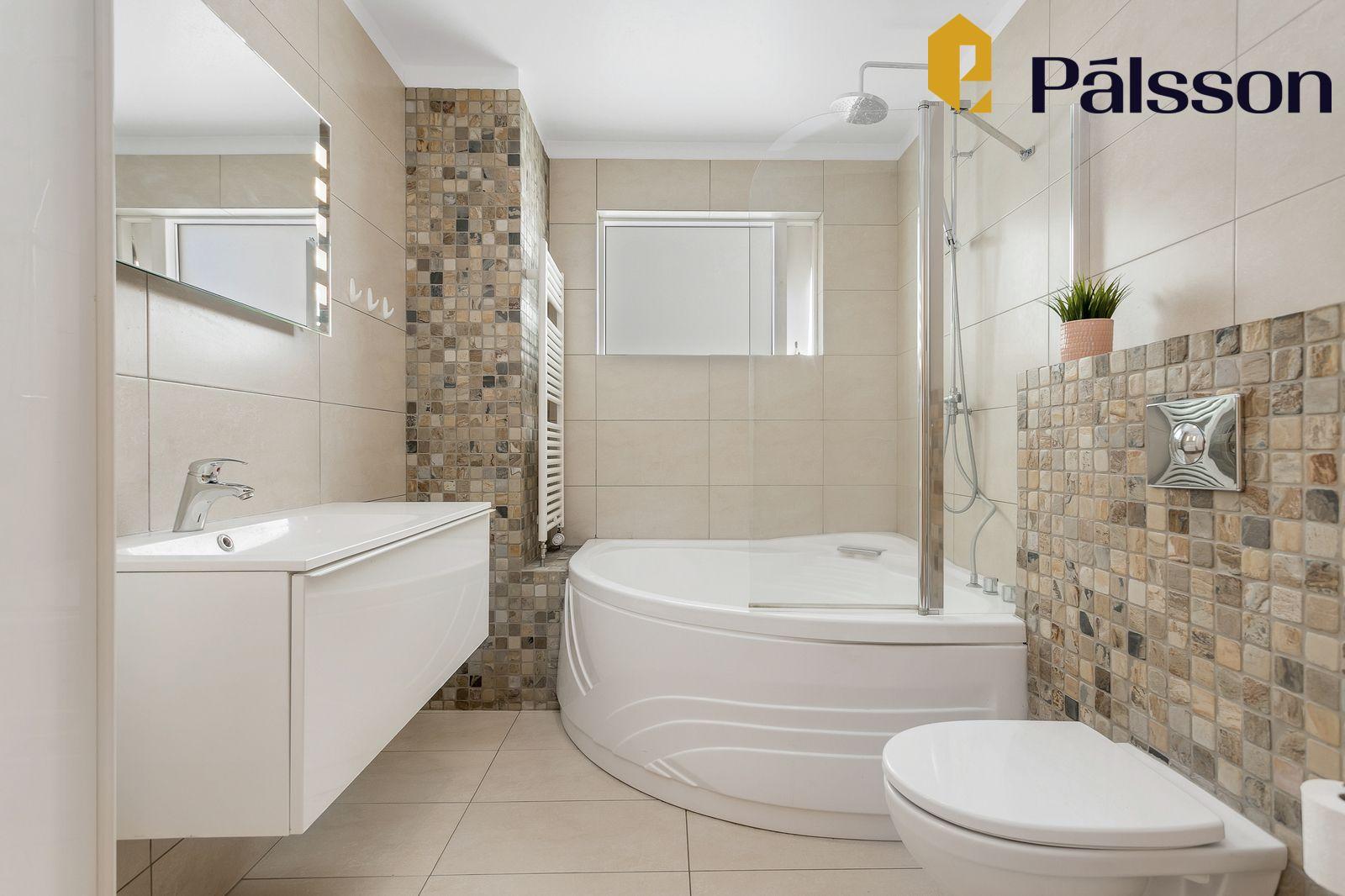 Baðherbergi er mjög skemmtilegt. Stórt hornbaðkar. Nýleg, hvít innrétting með vaski. Flísar á gólfi og veggjum.