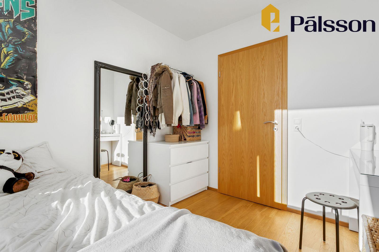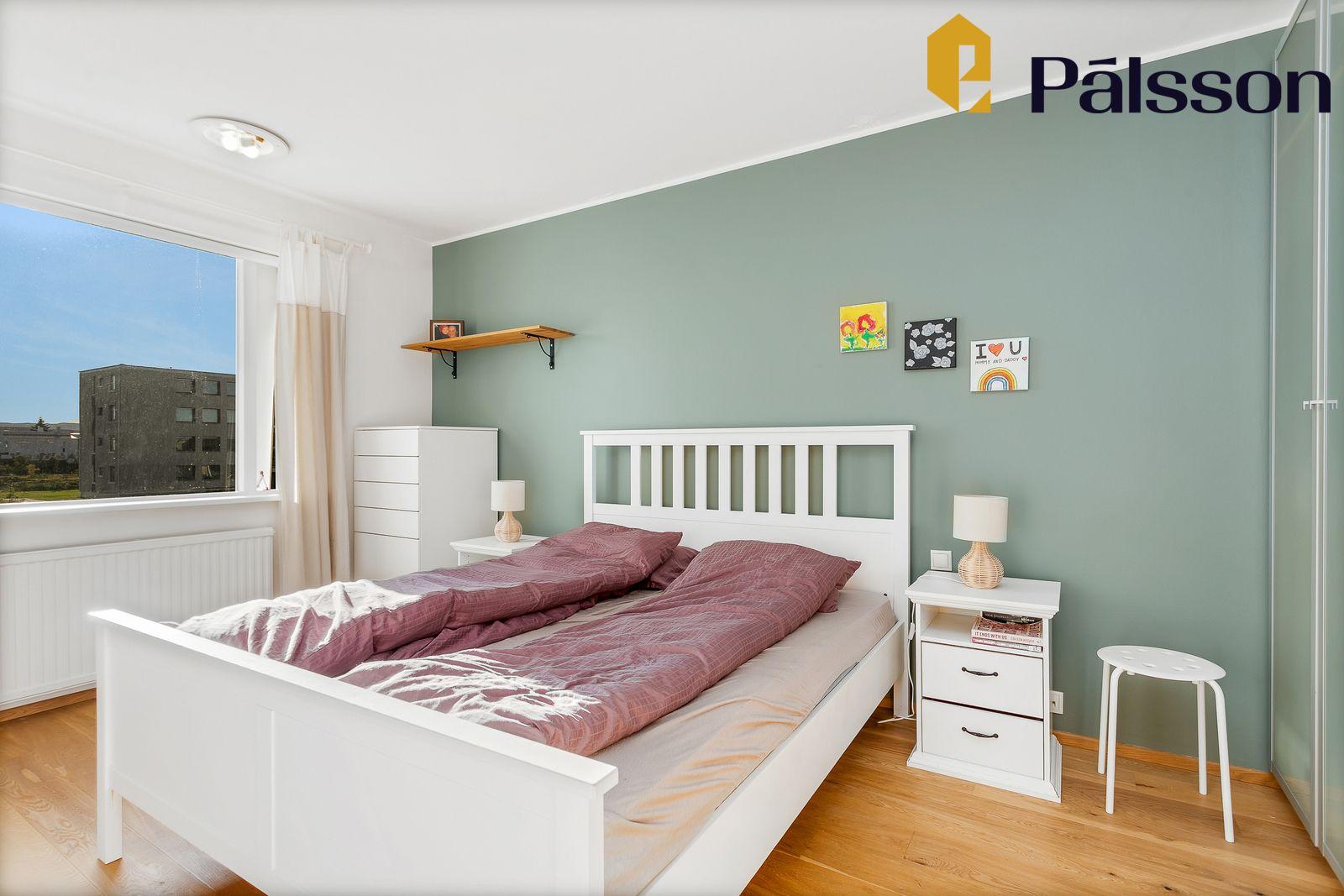 Hjónaherbergi er úmgott með innbyggðum hvítum skápum yfir heilan vegg. Parket á gólfi