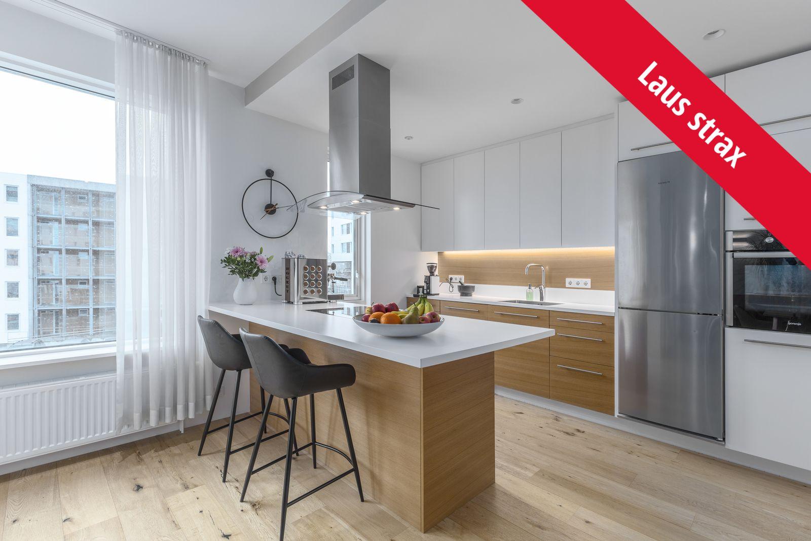 Eldhús parket á gólfi, ljós og háglans hvít viðarinnrétting, tengi fyrir uppþvottavél, eyja með helluborði.