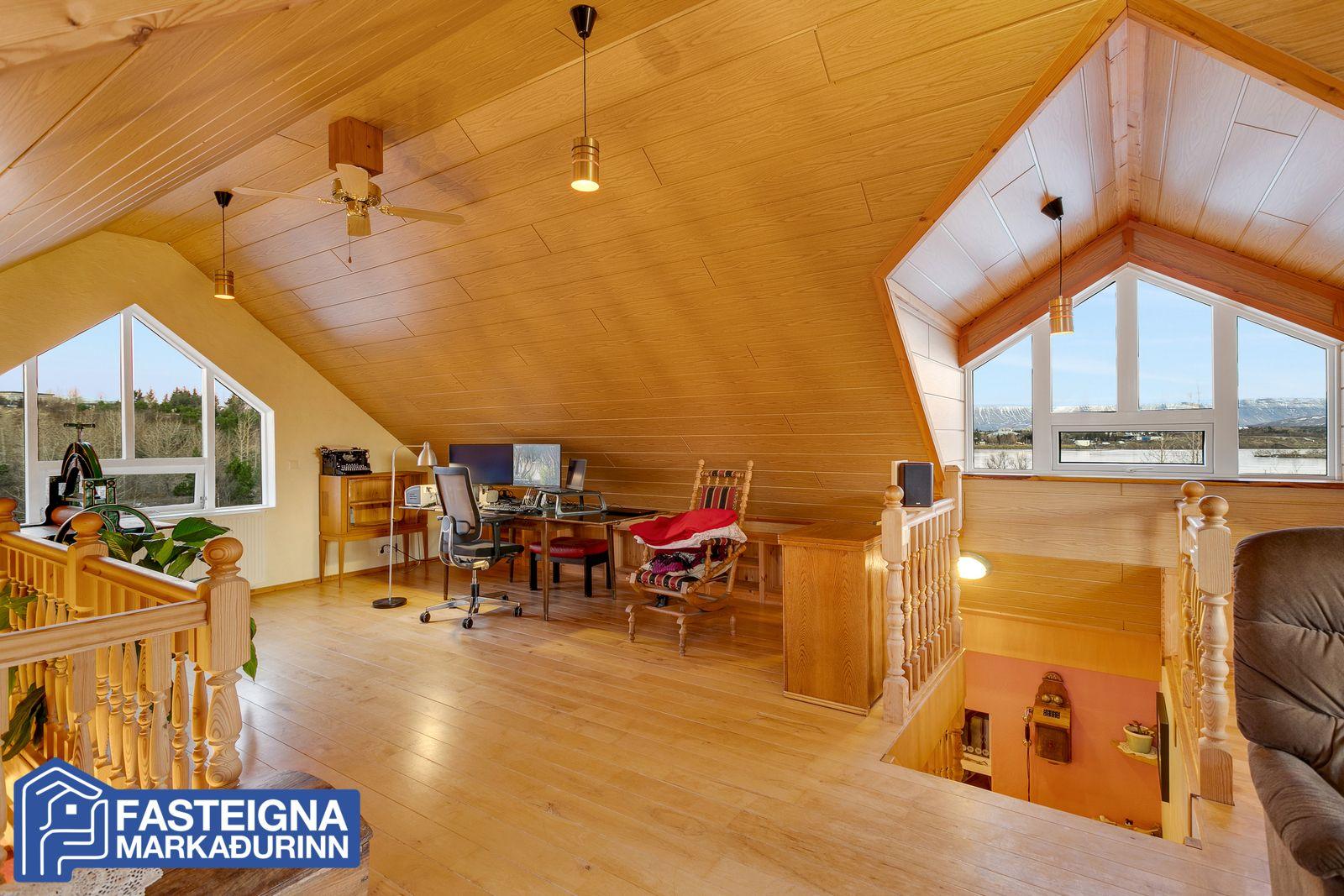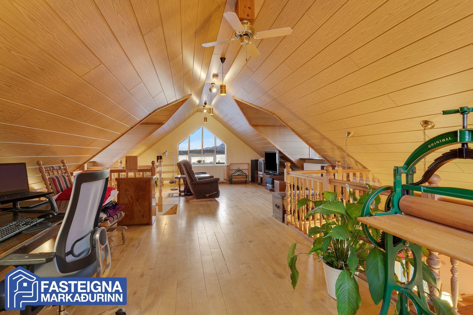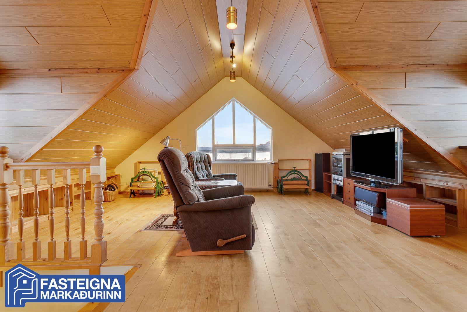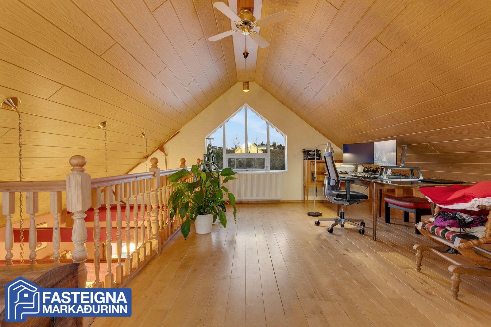 Gengið er upp í rishæð hússins um viðarstiga frá holi.Rishæð, parketlagt opið stórt rými með aukinni lofthæð, gluggum til allra átta og einstöku útsýni.