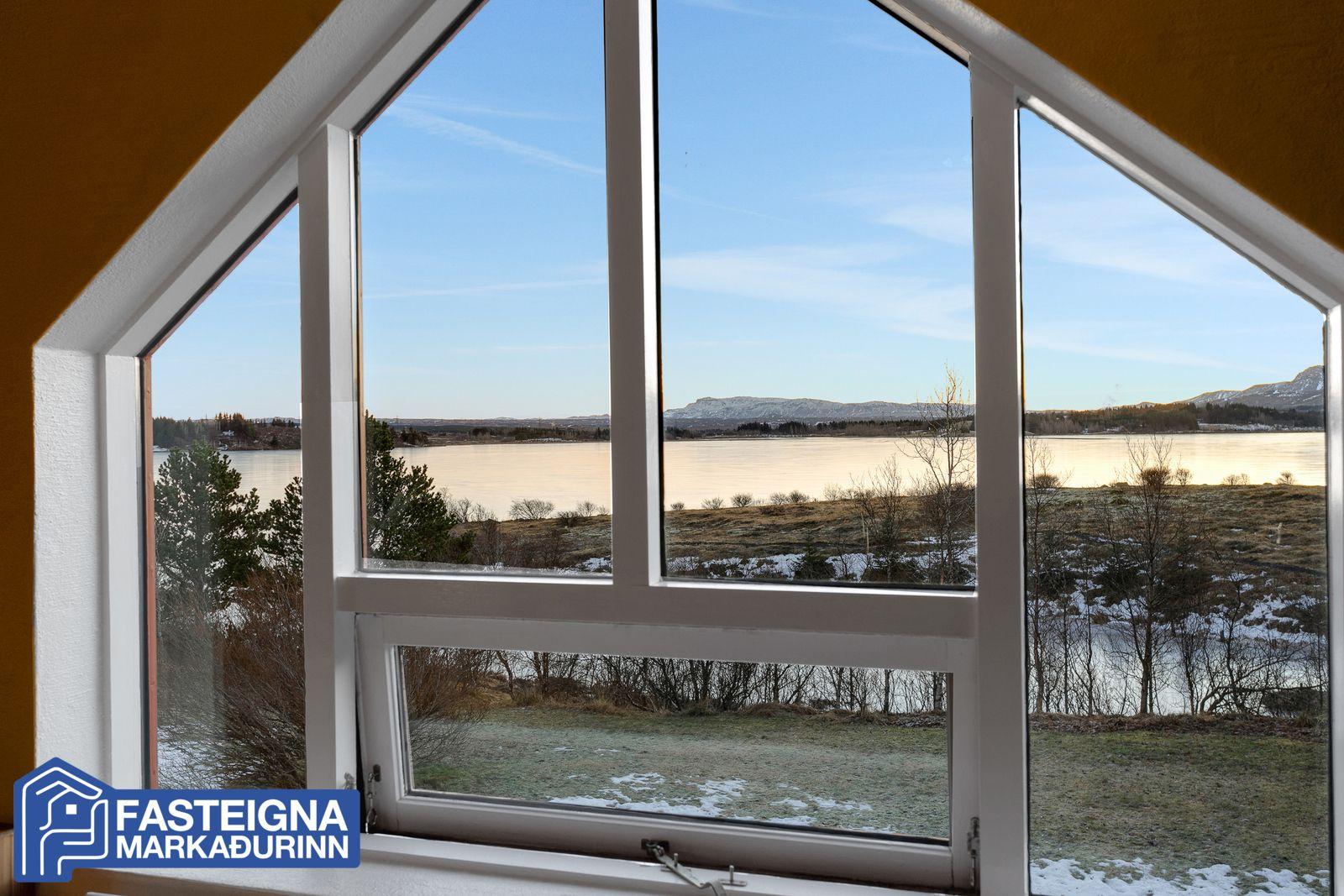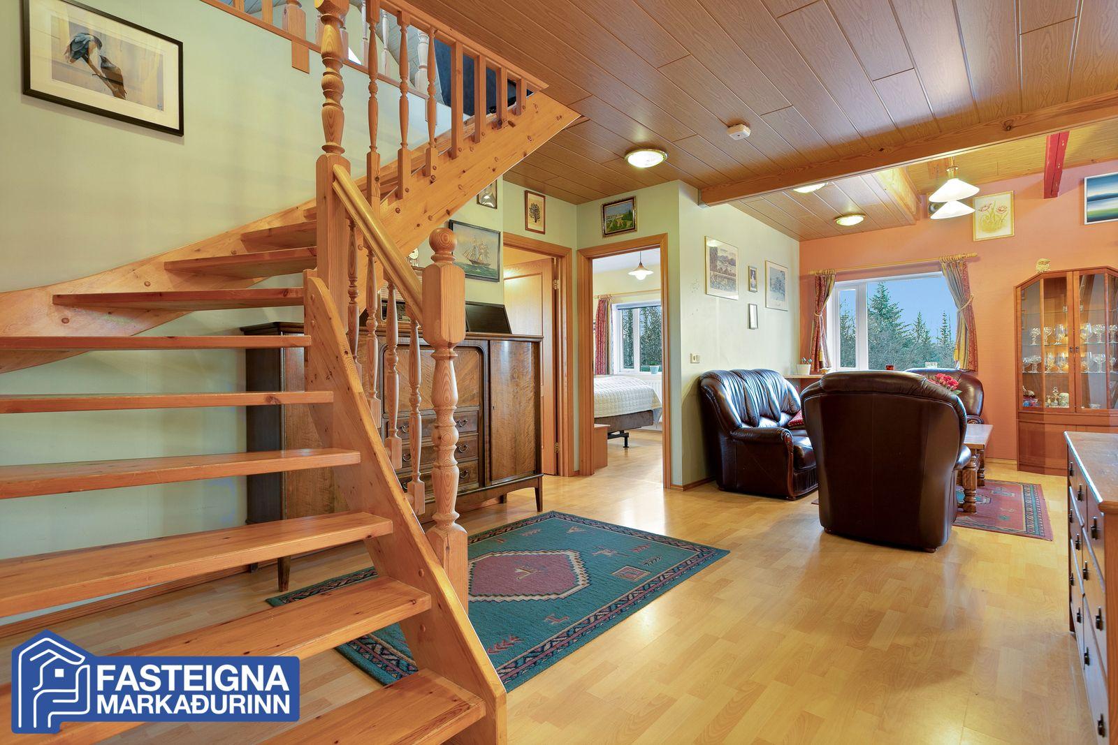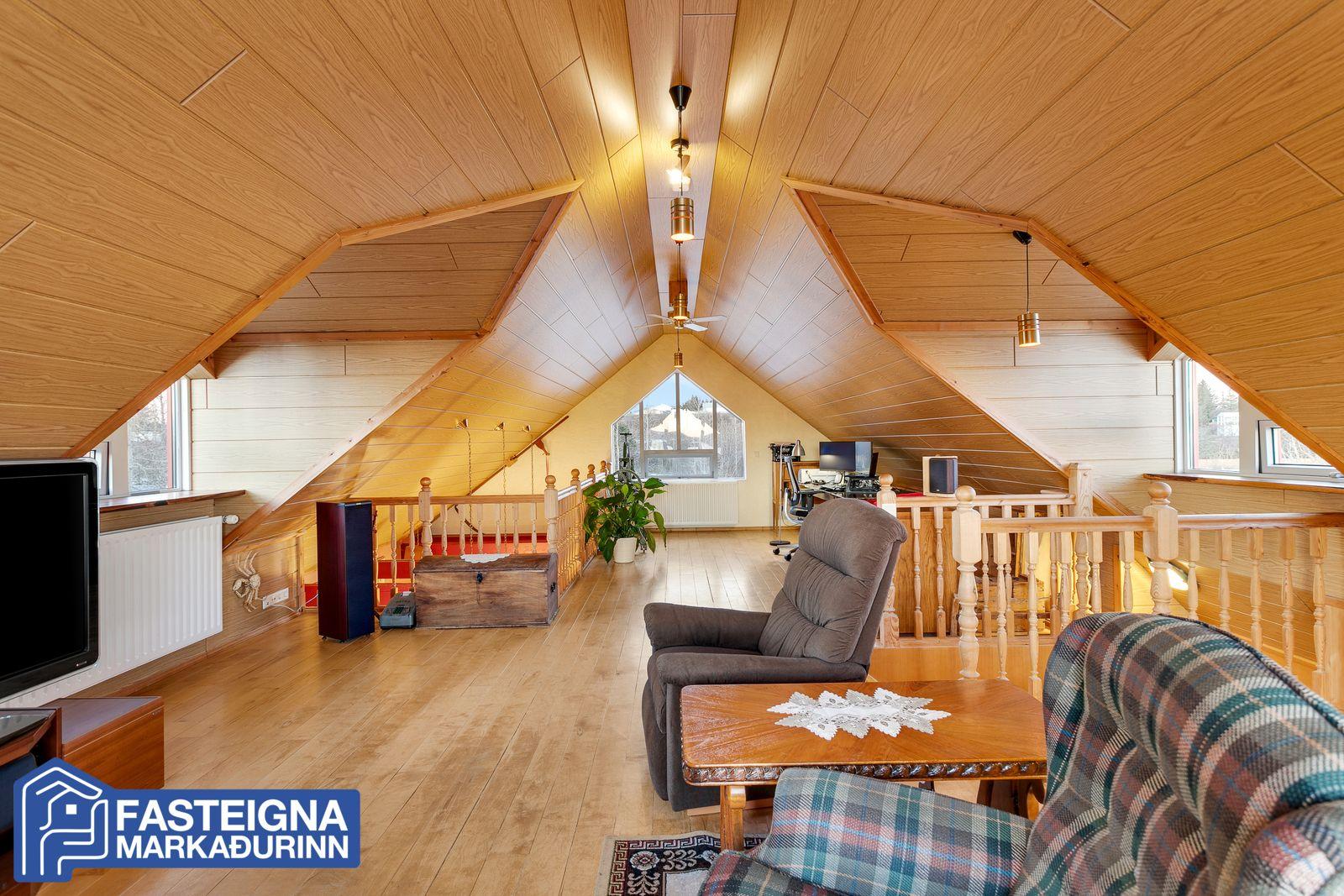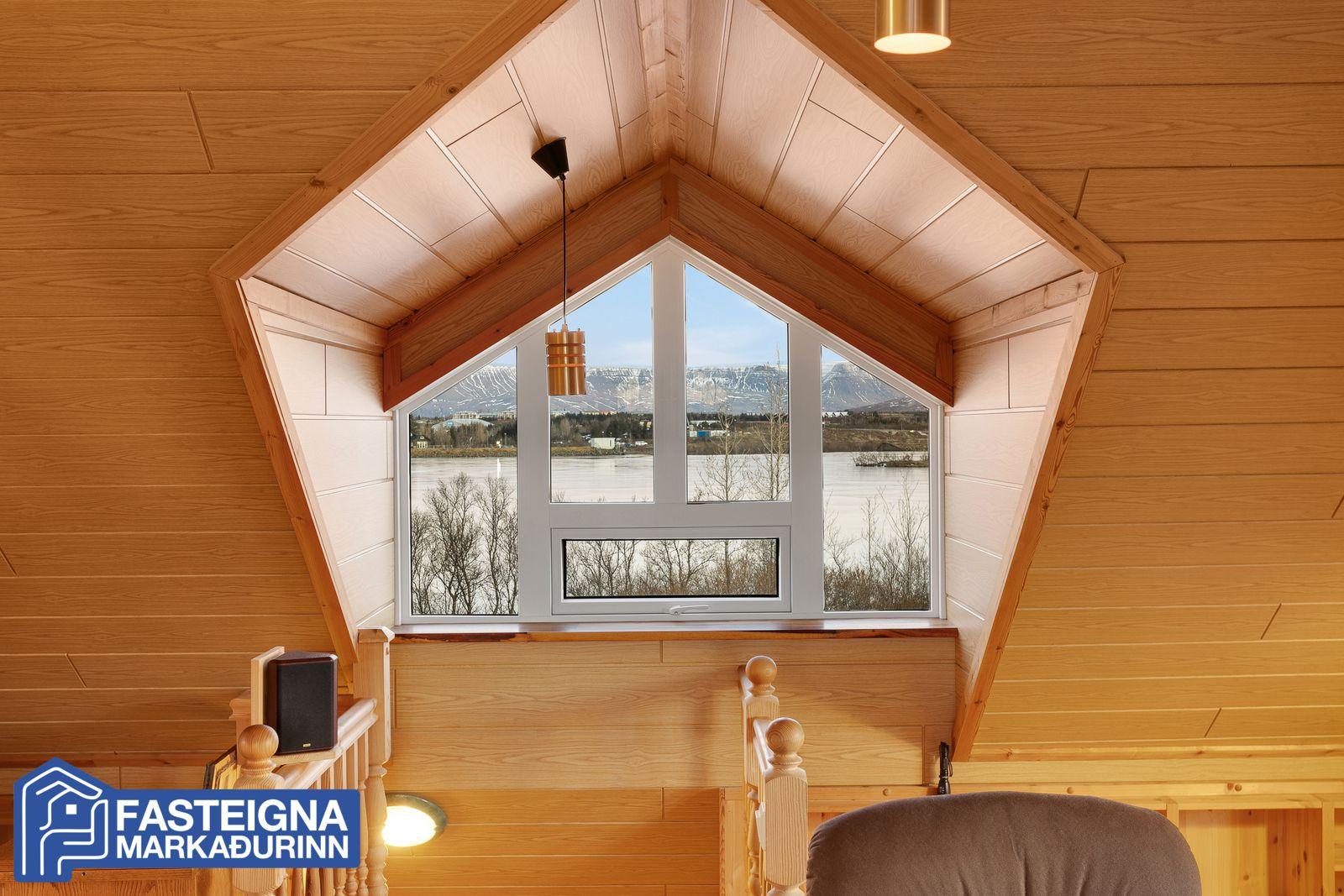 Gengið er upp í rishæð hússins um viðarstiga frá holi.Rishæð, parketlagt opið stórt rými með aukinni lofthæð, gluggum til allra átta og einstöku útsýni.
