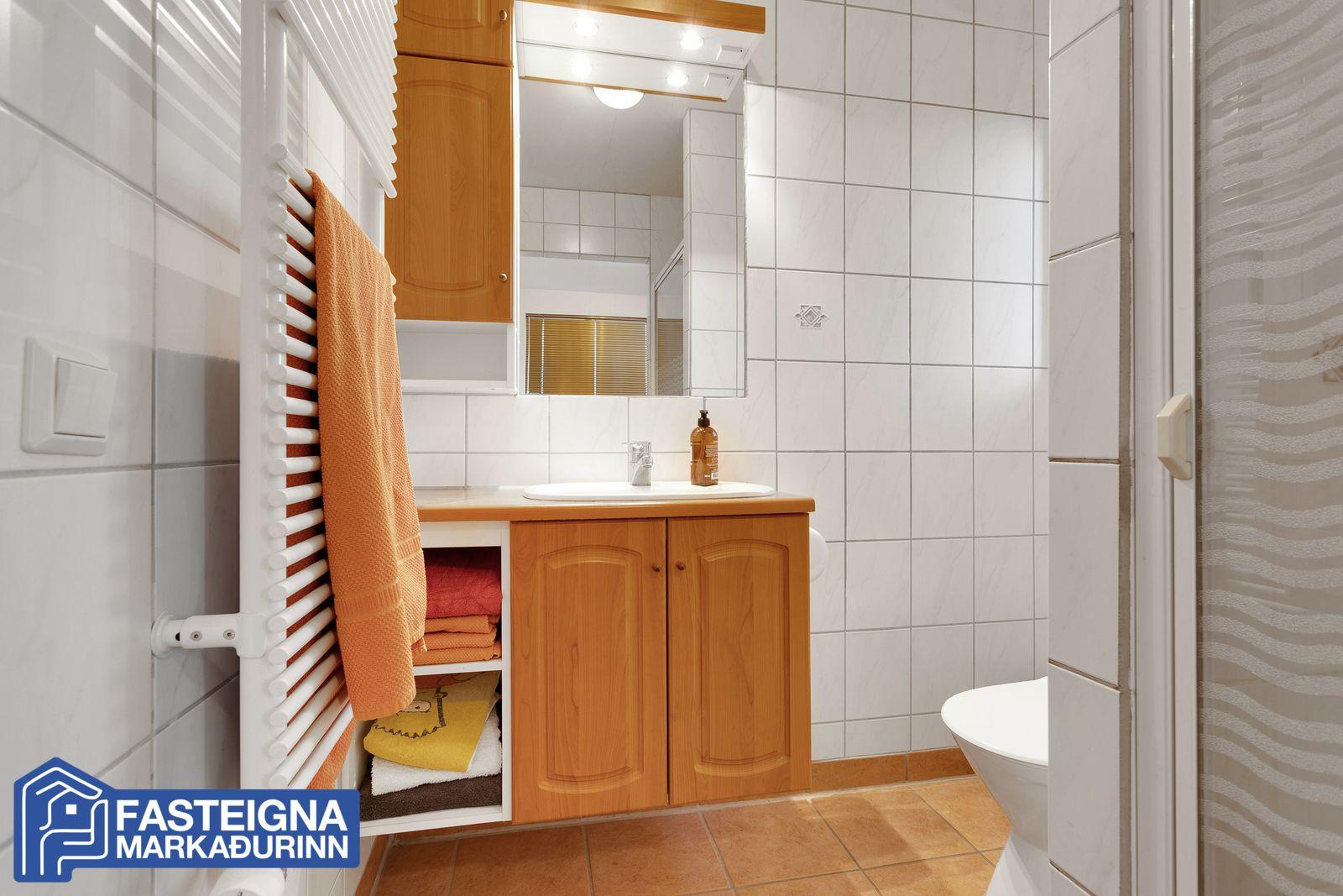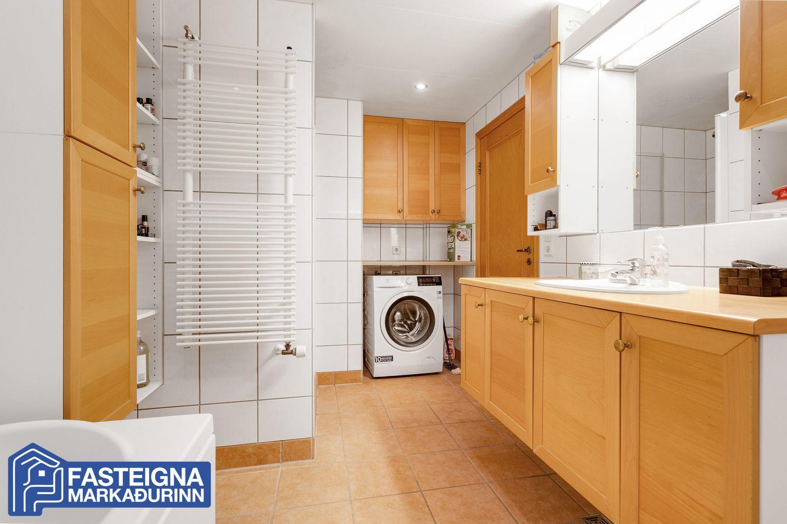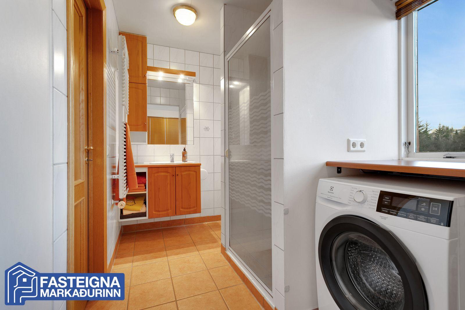 Baðherbergi, inn af forstofu er mjög rúmgott, með glugga, flísalagt, innrétting, sturtuklefi, handklæðaofn og tengi fyrir þvottavél og þurrkara.