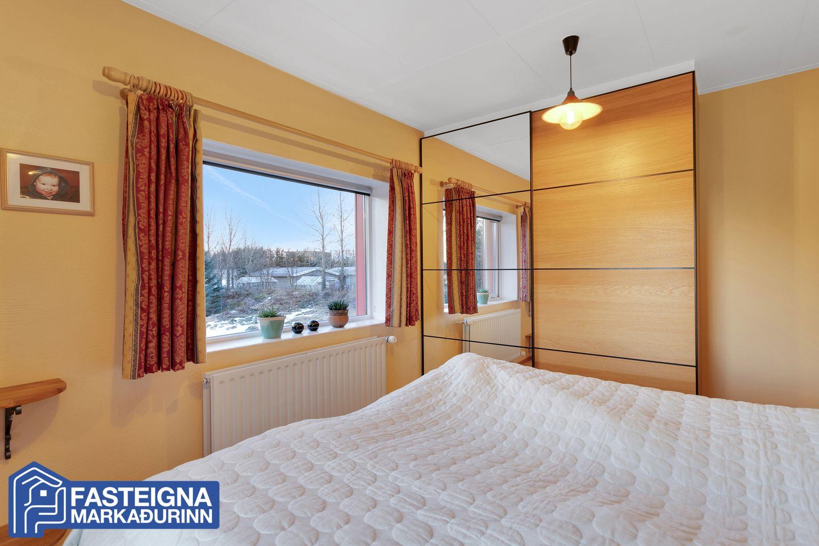 Hjónaherbergi, parketlagt með gluggum í tvær áttir og góðum fataskápum.