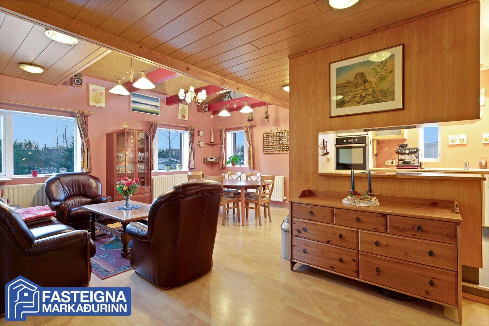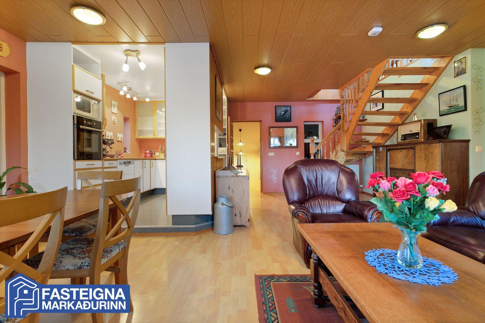Borðstofa / stofa, parketlögð í einu rými og aukin lofthæð að hluta. Hurð er út frá borstofu þar sem gert er ráð fyrir svölum.