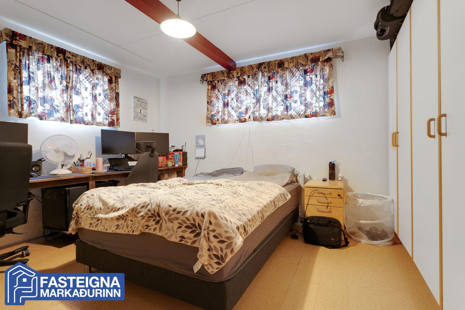 Herbergi ll, korklagt, með stórum fataskápum og gluggum í tvær áttir.