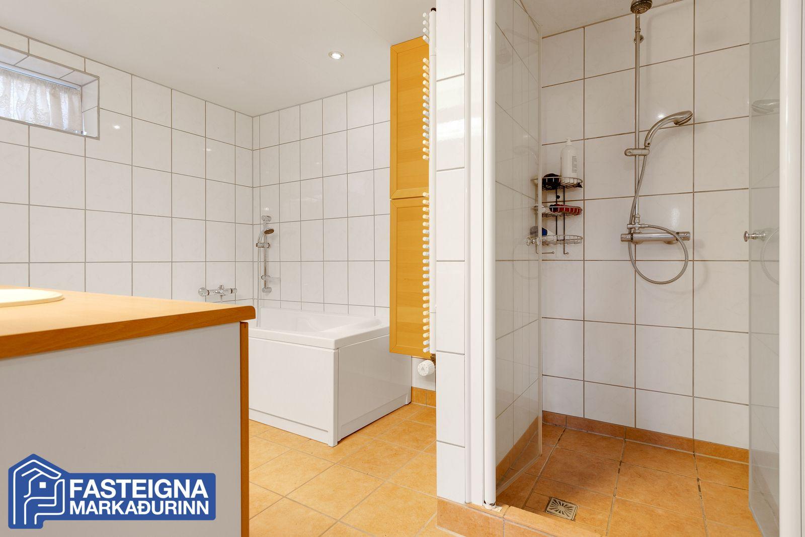 Baðherbergi, rúmgott með glugga, flísalagt gólf og veggir, handklæðaofn, baðkar, innrétting og flísalögð sturta. Tengi er fyrir þvottavél og þurrkara.