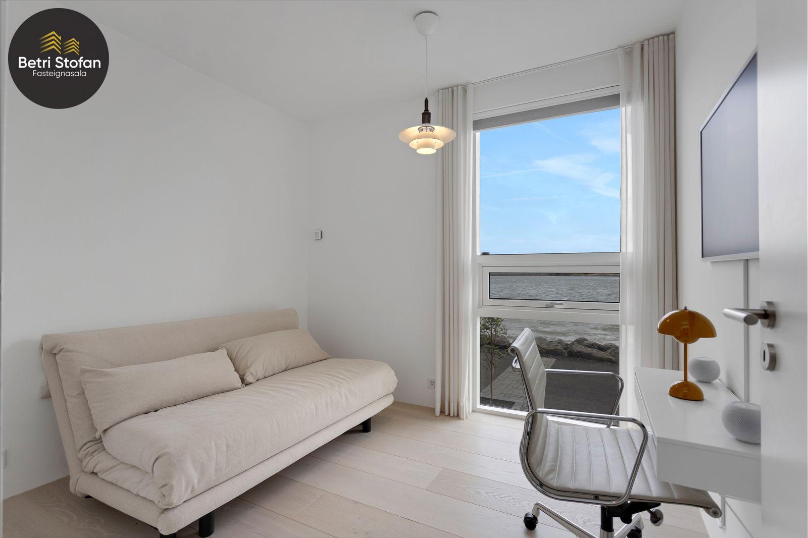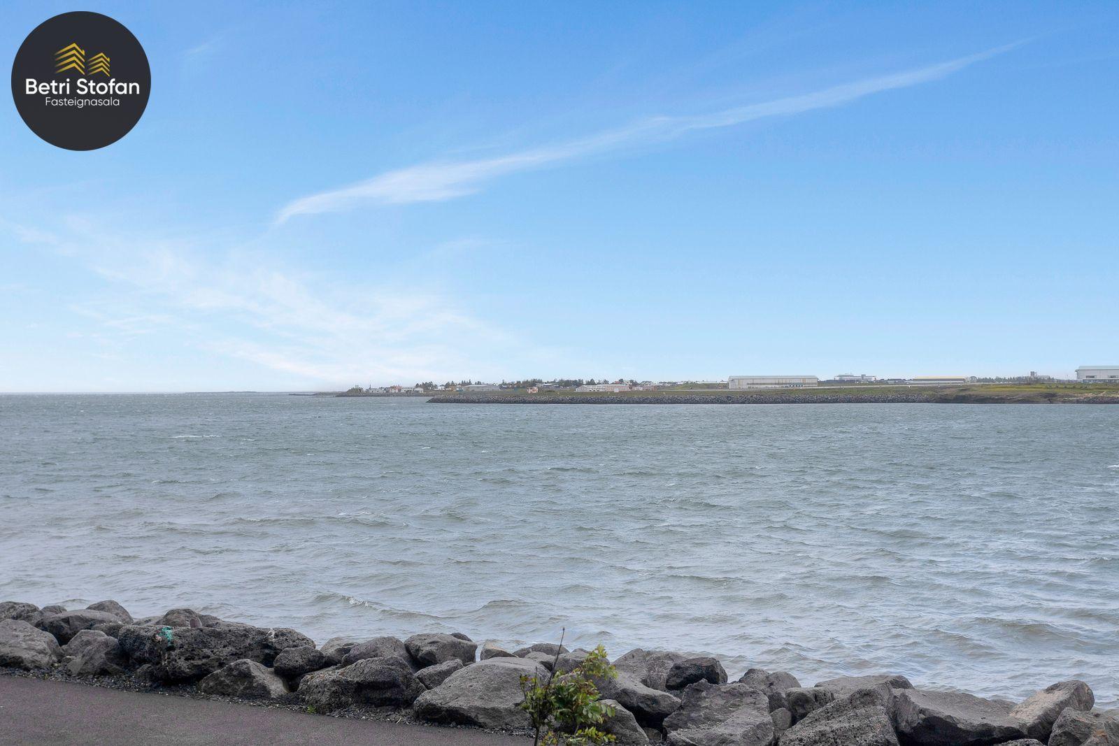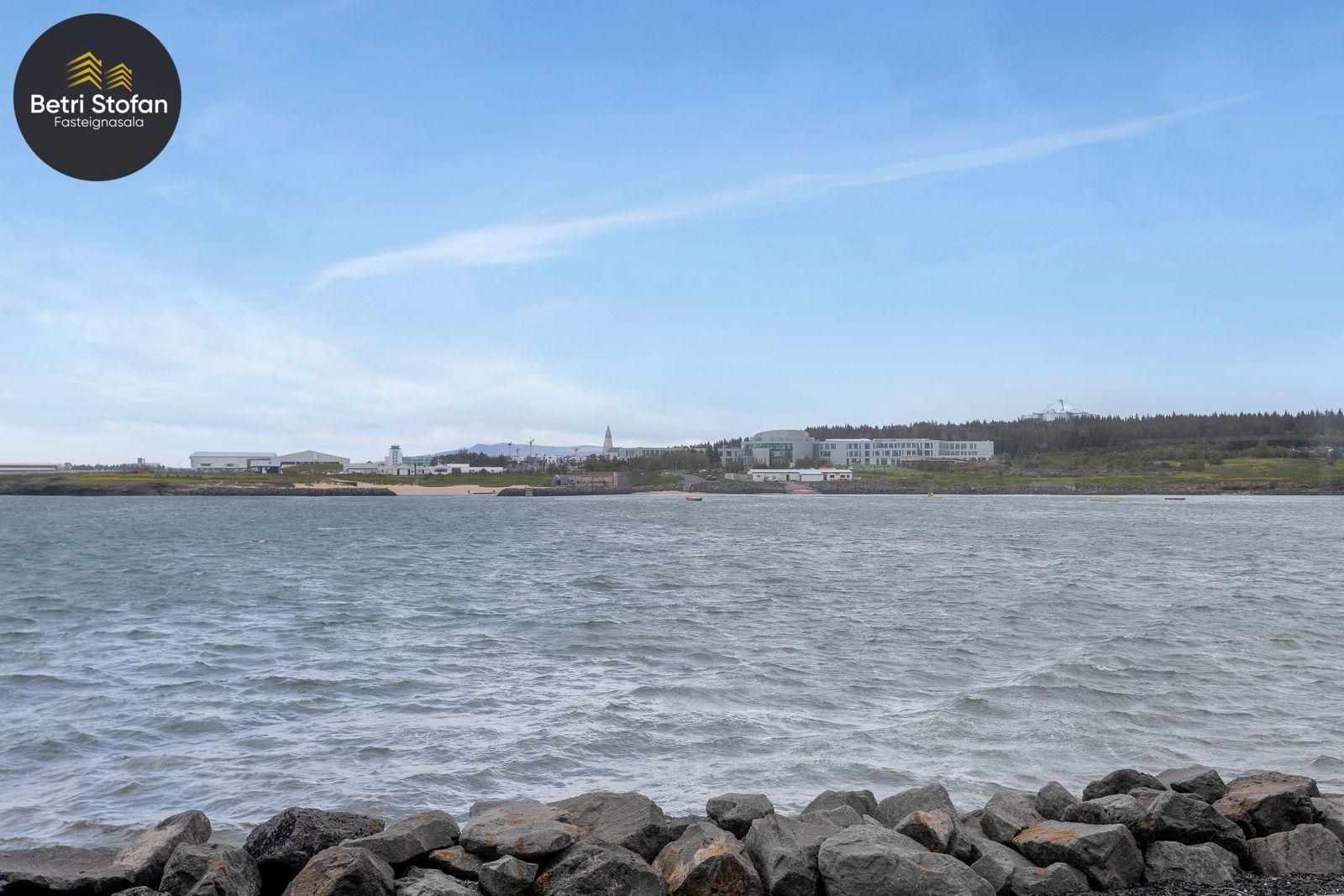 Einstakt útsýni úr stofu yfir Fossvoginn, Nauthólsvík og á Snæfellsjökul.
