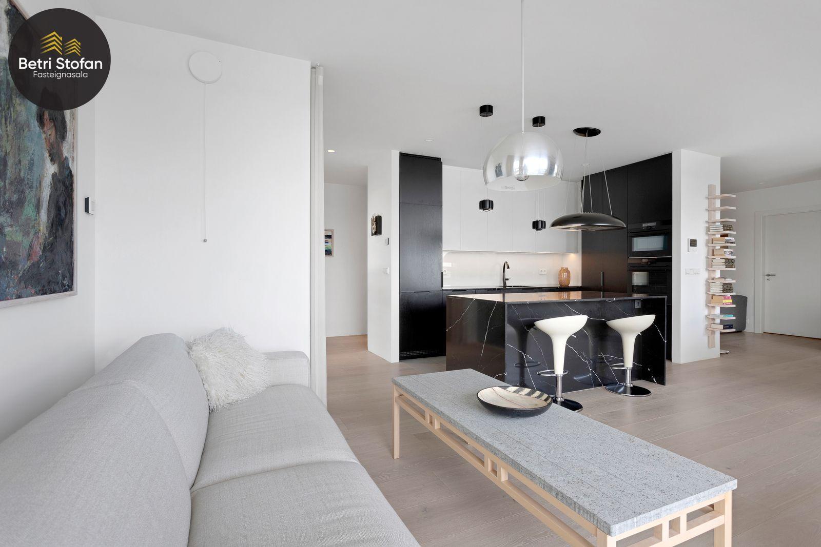Borðplötur úr Kvarts steini frá S. Helgasyni og eldhústæki frá AEG, innfelld loftljós í stórum hluta íbúðarinnar.