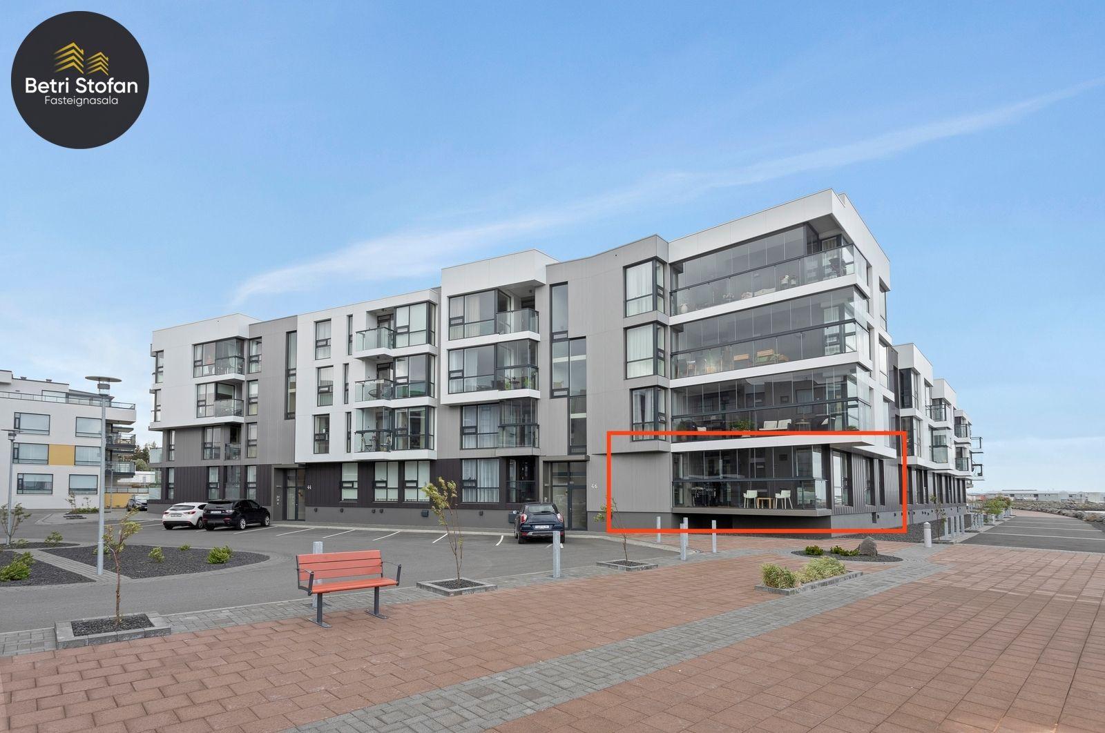 Gæsileg 3ja herbergja íbúð á 1.hæð, merkt 105 með einstöku sjávarútsýni í nýlegu álklæddu lyftuhúsi með stæði í bílakjallara, Tvö baðherbergi. Gólfhiti er í íbúðinni.