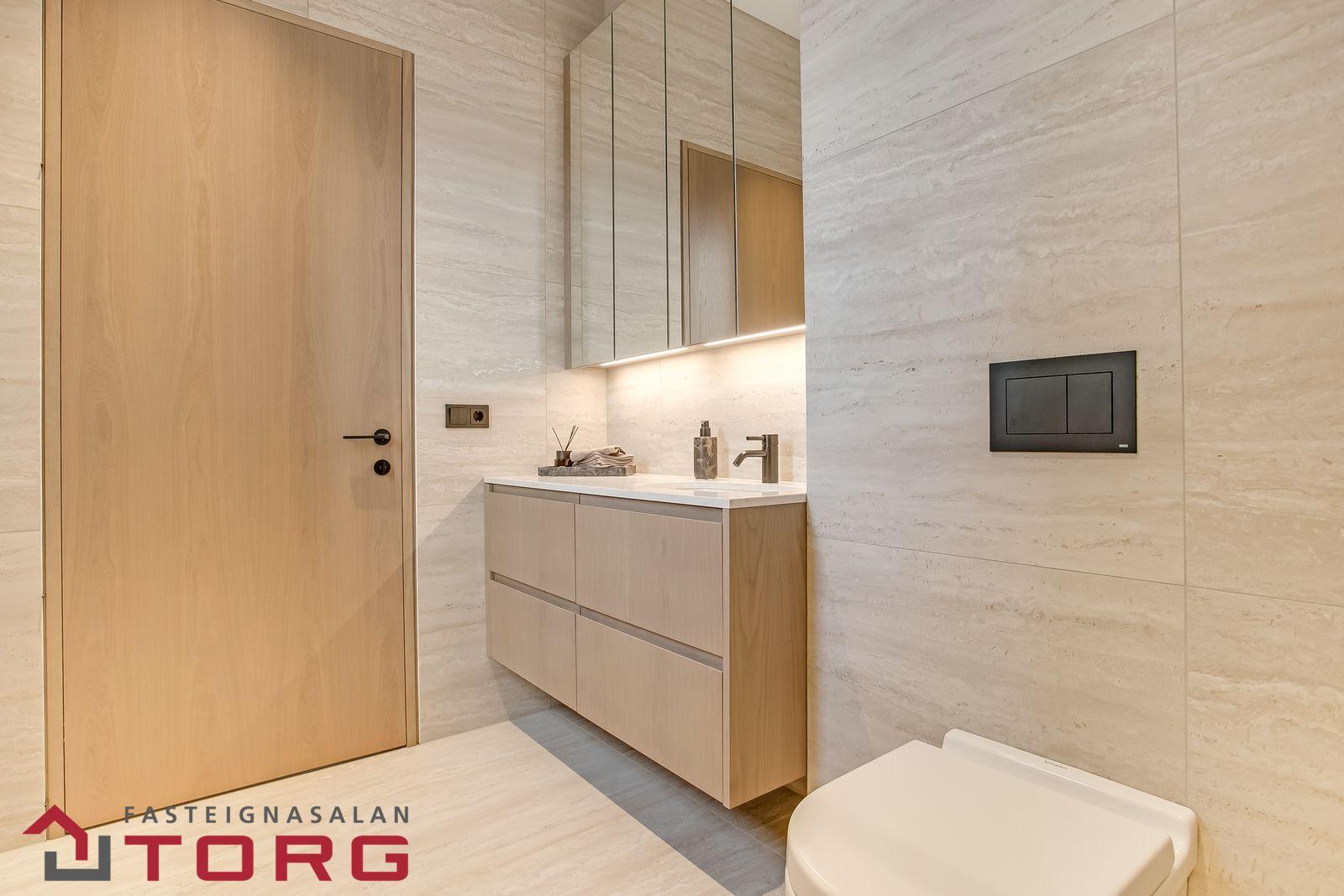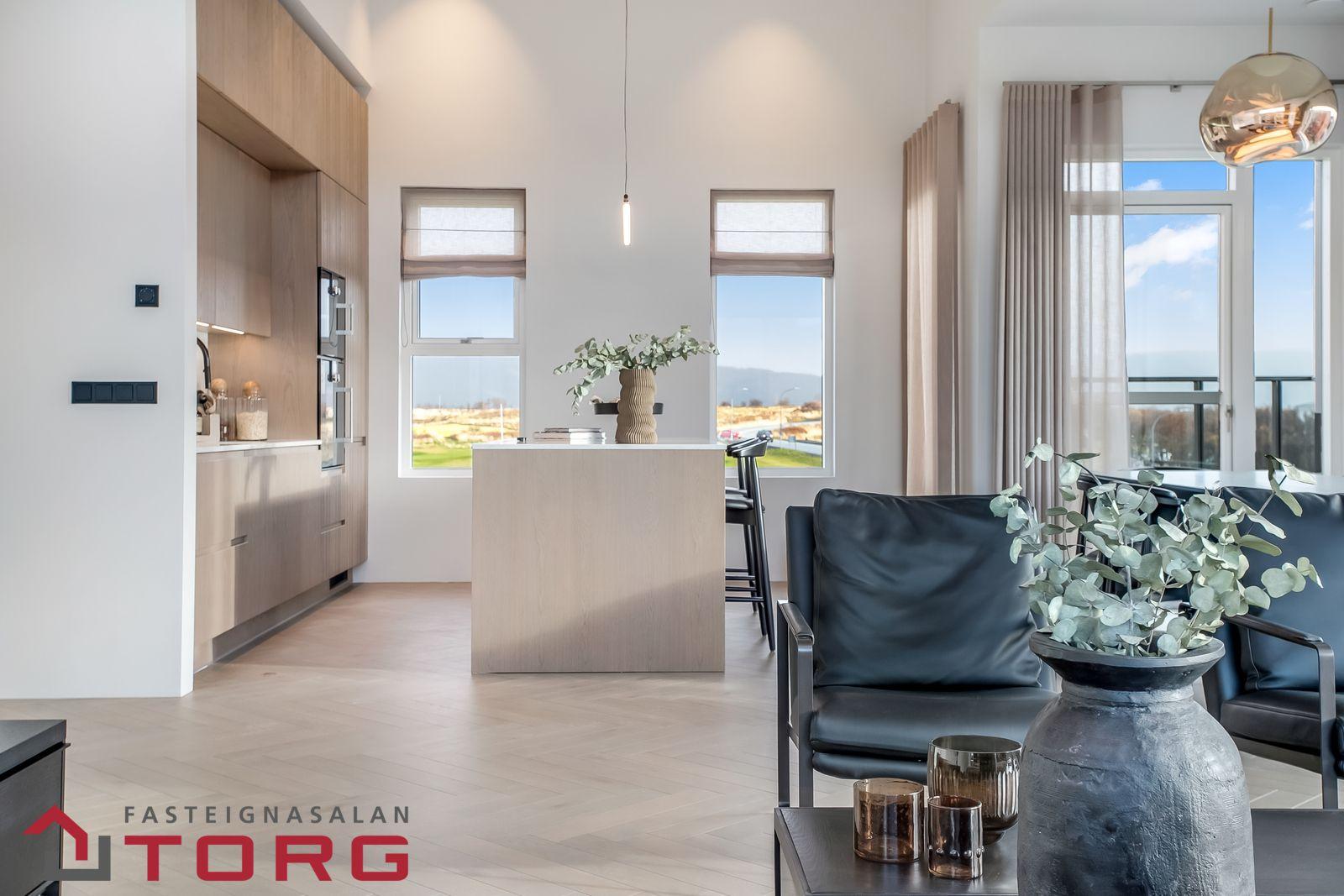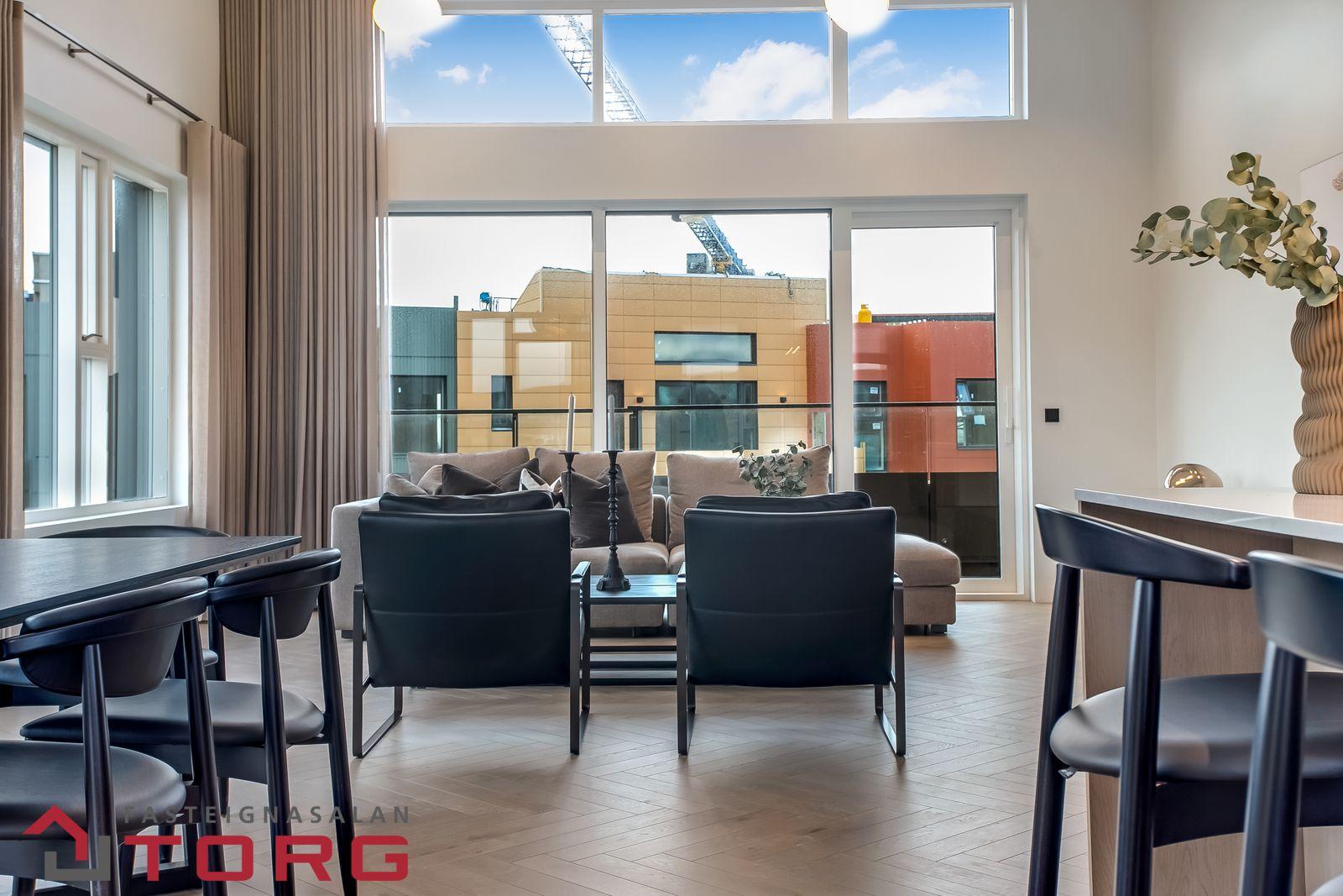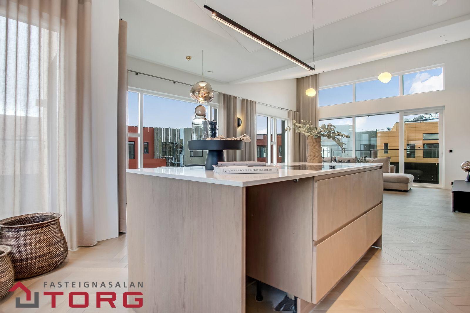 Fasteignasalan TORG kynnir: Loft-gæði / Hljóð-gæði / Birtu-gæði! Húsið í Svansvottunarferli! Um er að ræða falleg 3ja herbergja íbúð á efstu hæð með tvennar svalir, bílskúr og bílastæði í bílakjallara. Íbúð merkt:0408, og skilast fullbúin án gólfefna. Eignin er alls 193,7fm að stærð á 4. hæð í góðu lyftuhúsi. Íbúðin sjálf er skráð 138,7fm og skiptist í anddyri, alrými með eldhúsi og stofu með útgengi út á þaksvalir inn í garð um 17,3fm, og vestur-svalir um 9,3fm, 2 góð svefnherbergi, tvö góð baðherbergi, sér þvottaherbergi, geymsla í sameign merkt: 0106, skráð 11,3fm. Bílksúr í sameign, merktur: 007, skráður 43,7fm, ásamt bílstæði í bílakjallara merkt: N28. Allar nánari upplýsingar, teikningar, og skilalýsingu er hægt að nálgast með að hafa samband við Svavar, fasteignasali í GSM: 623-1717 eða svavar@fstorg.is Sjá nánari upplýsingar á heimasíðu verkefnisins HÉR
