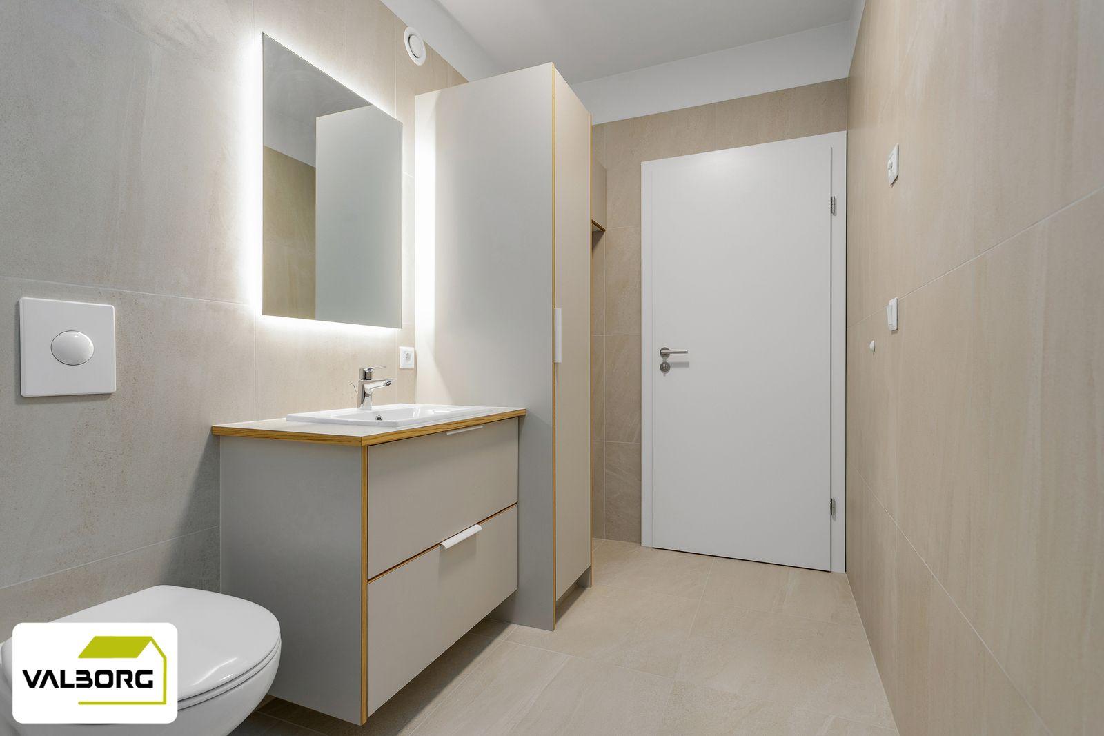 Baðherbergi/þvottaherbergi: Flísalögð í hólf og gólf og með glugga. Vegghengt salerni og walk in sturta. Tæki og búnaður frá Grohe. Innrétting með melamín yfirborði (plast). Flísar frá Parka og gólfhiti. Endaíbúðir með glugga.