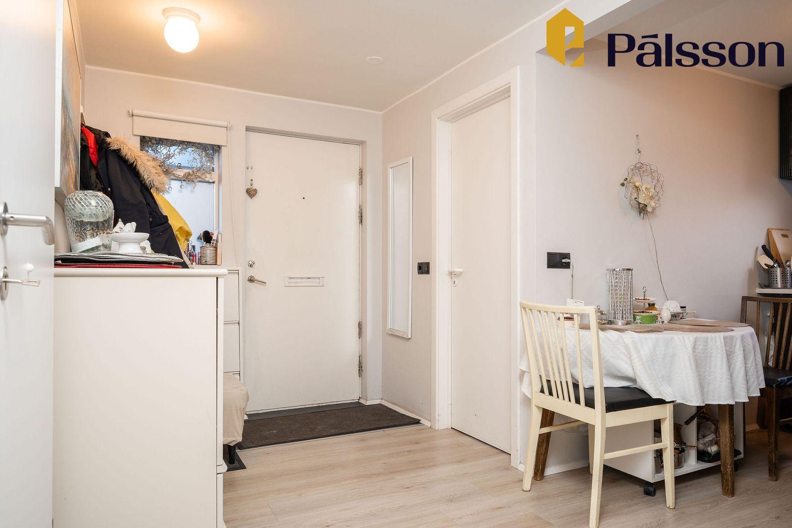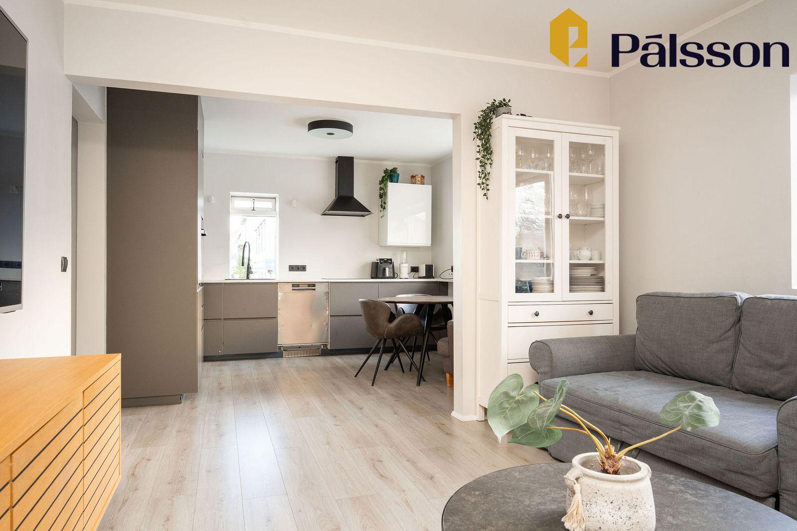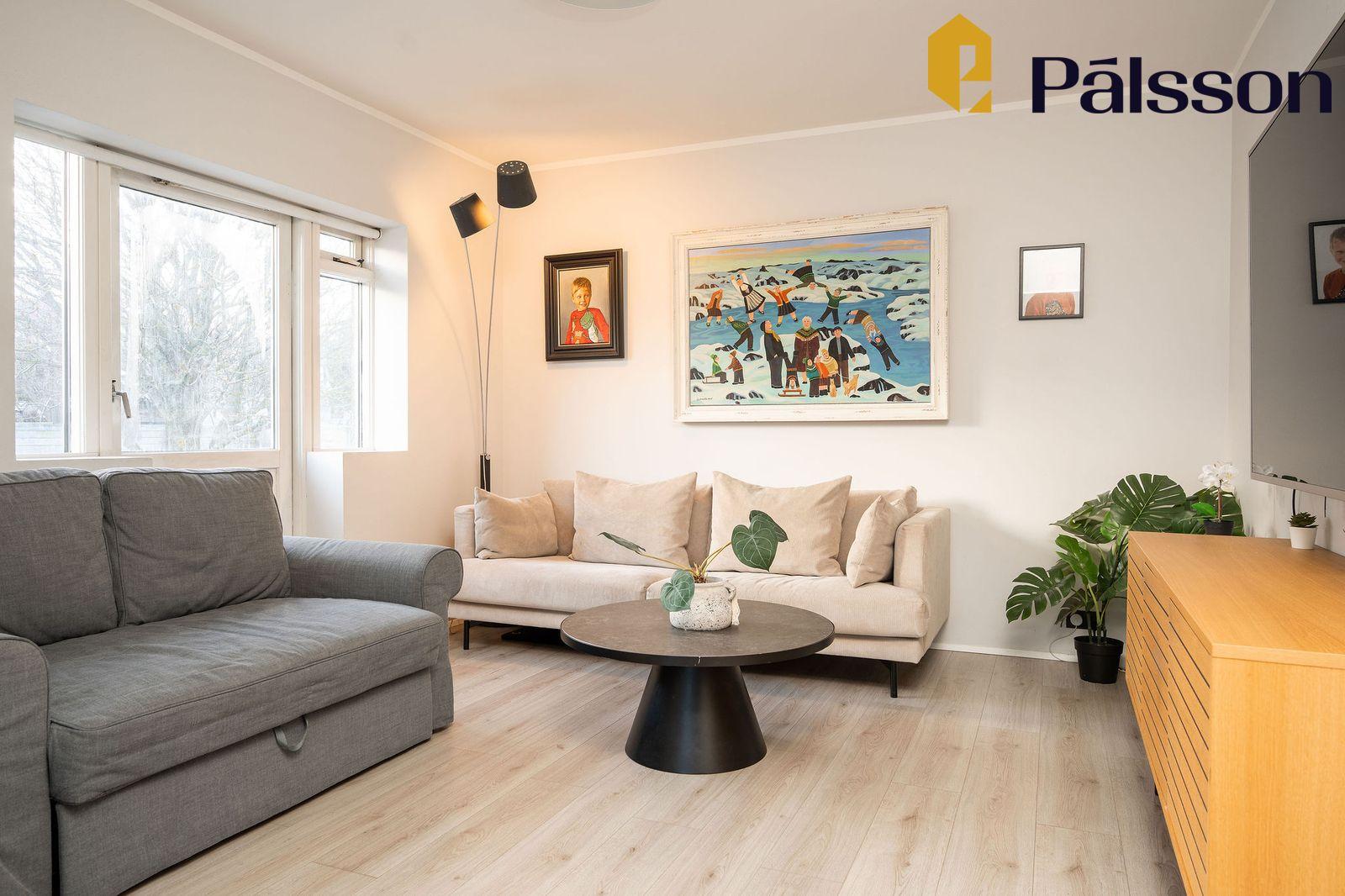 Stofa er björt með útgengi á svalir og þaðan eru tröppur niður á timbur verönd og út í gróinn suðurgarð.