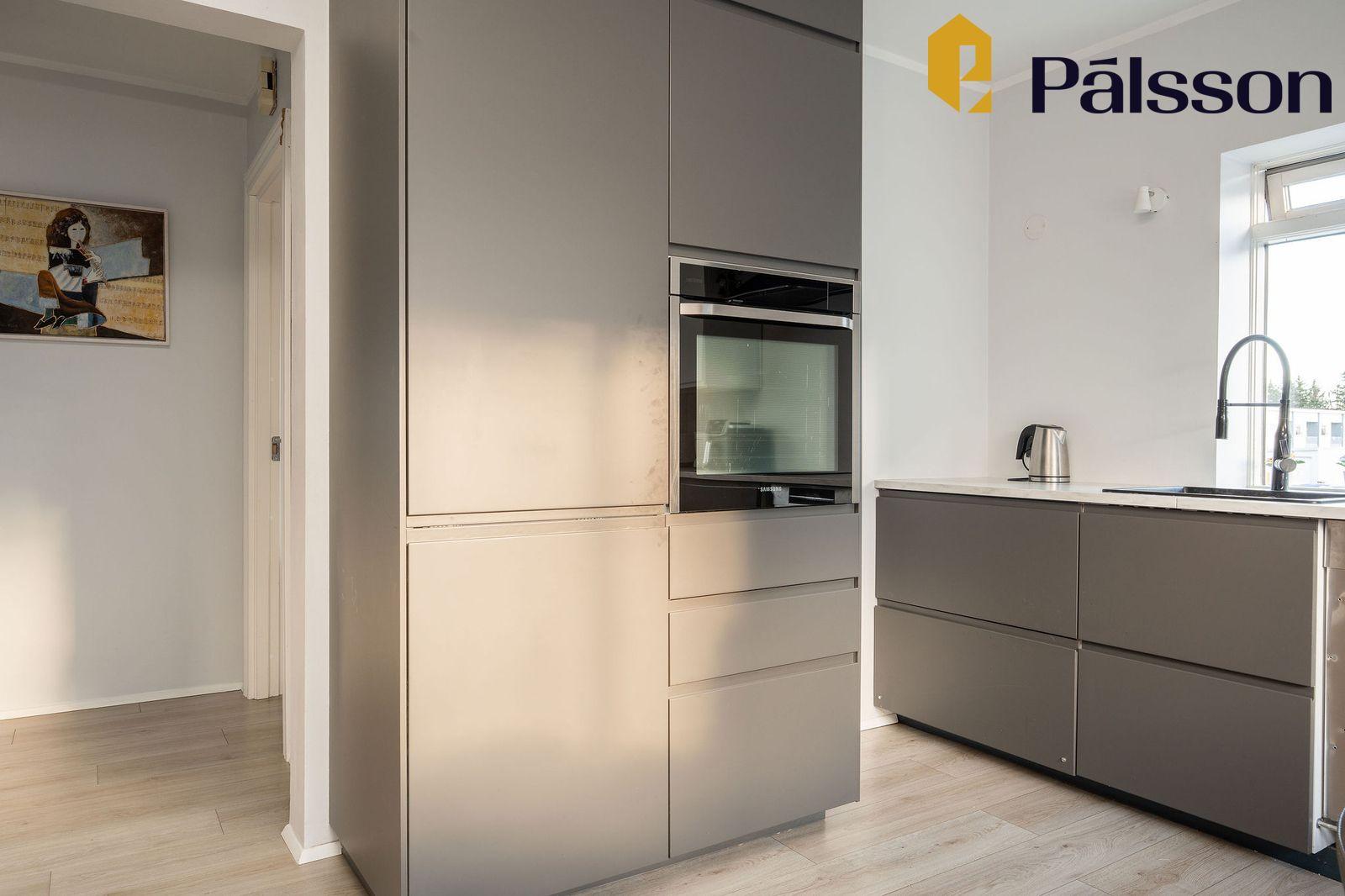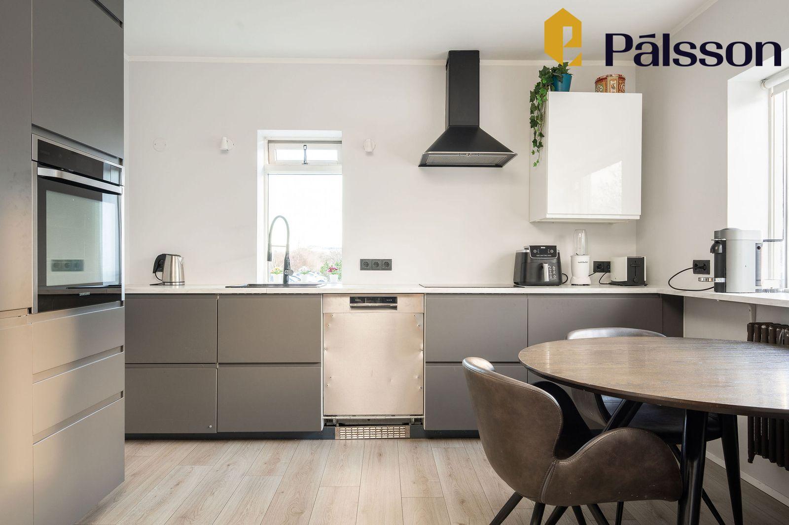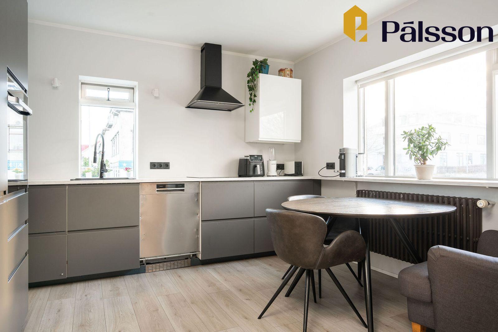 Eldhús er með hvítri innréttingu, innbyggðum ísskáp, bakaraofni, spanhelluborði, veggháf og tengi fyrir uppþvottavél. Góður borðkrókur. Parket á gólfi.