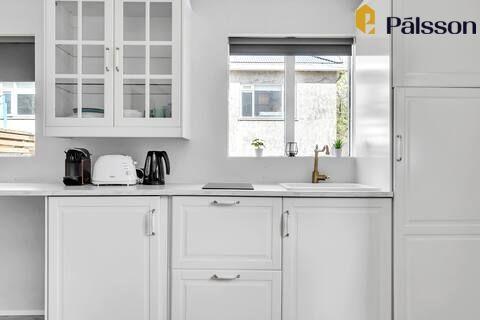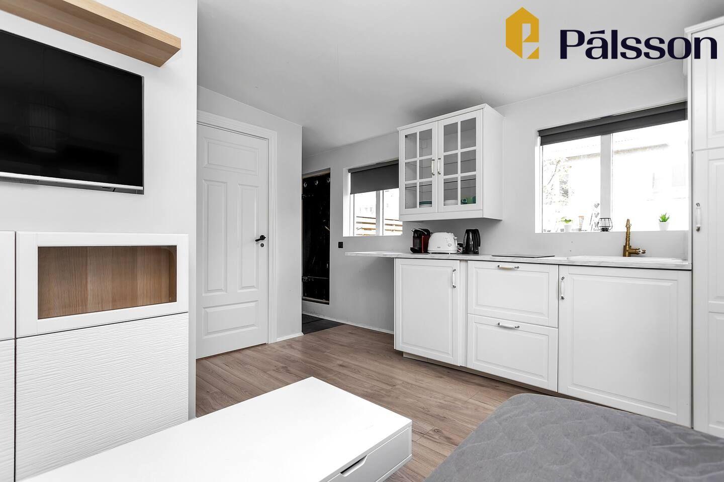 Bílskúr hefur verið breytt í stúdíóíbúð með alrými, eldhúsi og baðherbergi.