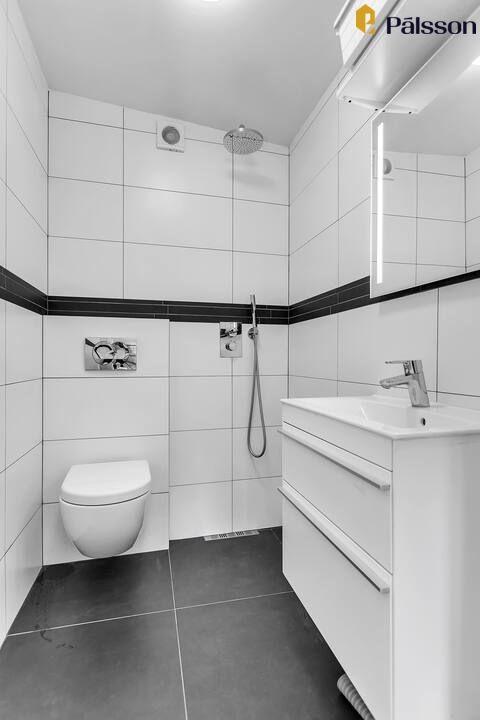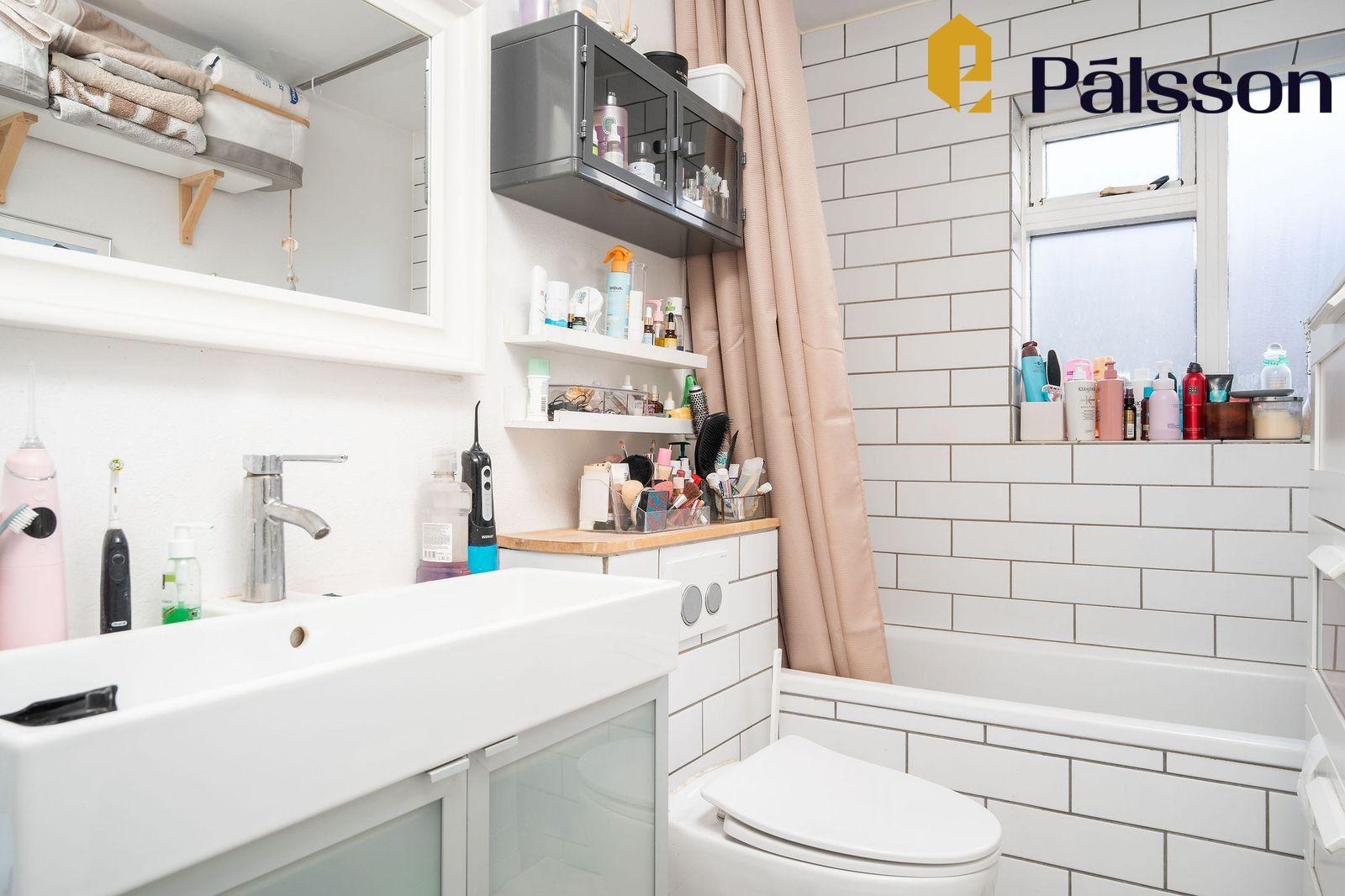 Baðherbergi hefur verið endurnýjað með sturtu, upphengdu salerni og handklæðaofni. Gluggi á baði og gólfhiti. Flísar á gólfi og hluta veggja.