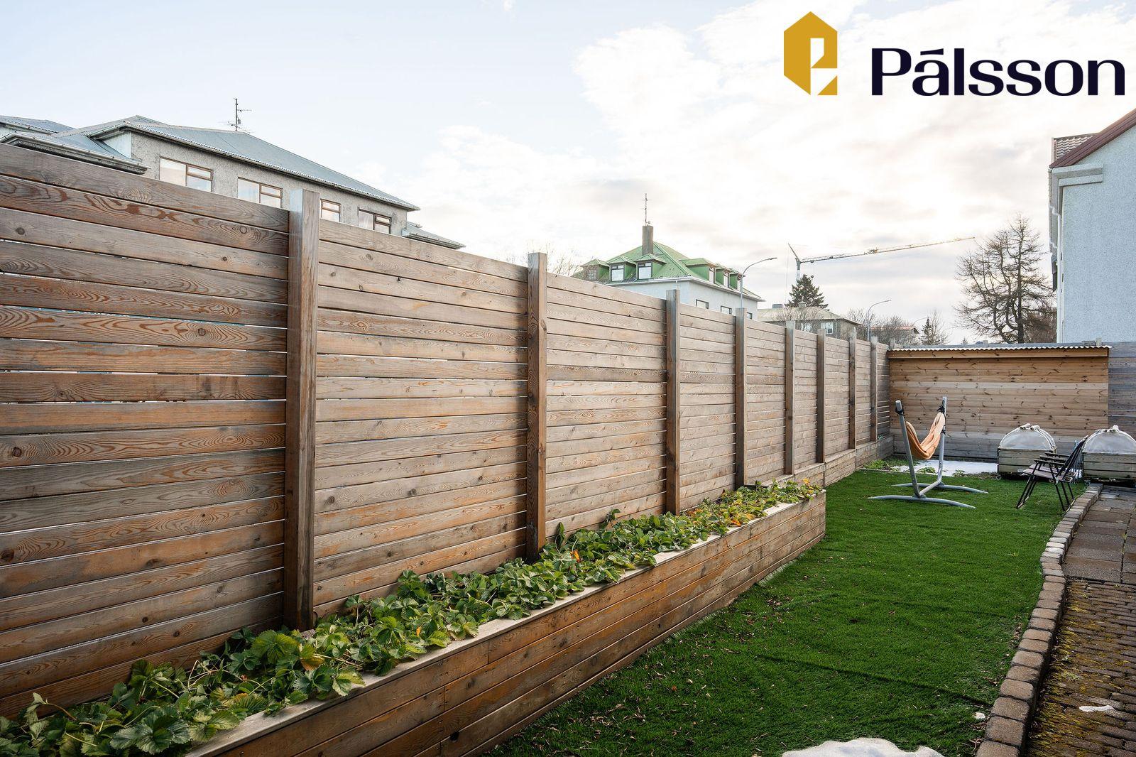 Skjólgóður garður með viðarverönd, skjólgirðingu og matjurtarkössum.
