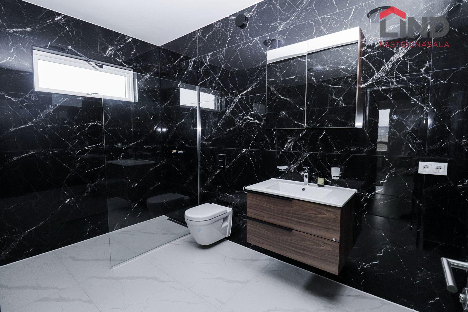 Baðherbergi: Rúmgóð, svartar 120x60 flísar í marmaraútliti, upphengt salerni, dökk viðarlituð innrétting með hvítri borðplötu, sturta með gleri, speglaskápur.