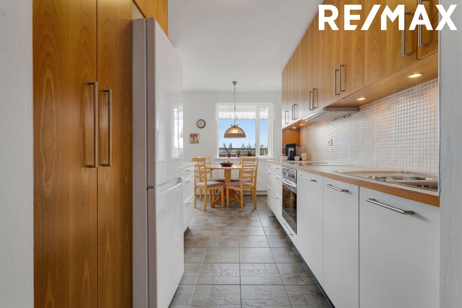 Eldhús er með flísum á gólfi. Eldhúskrókur og falleg innrétting. Flísar á milli skápa.