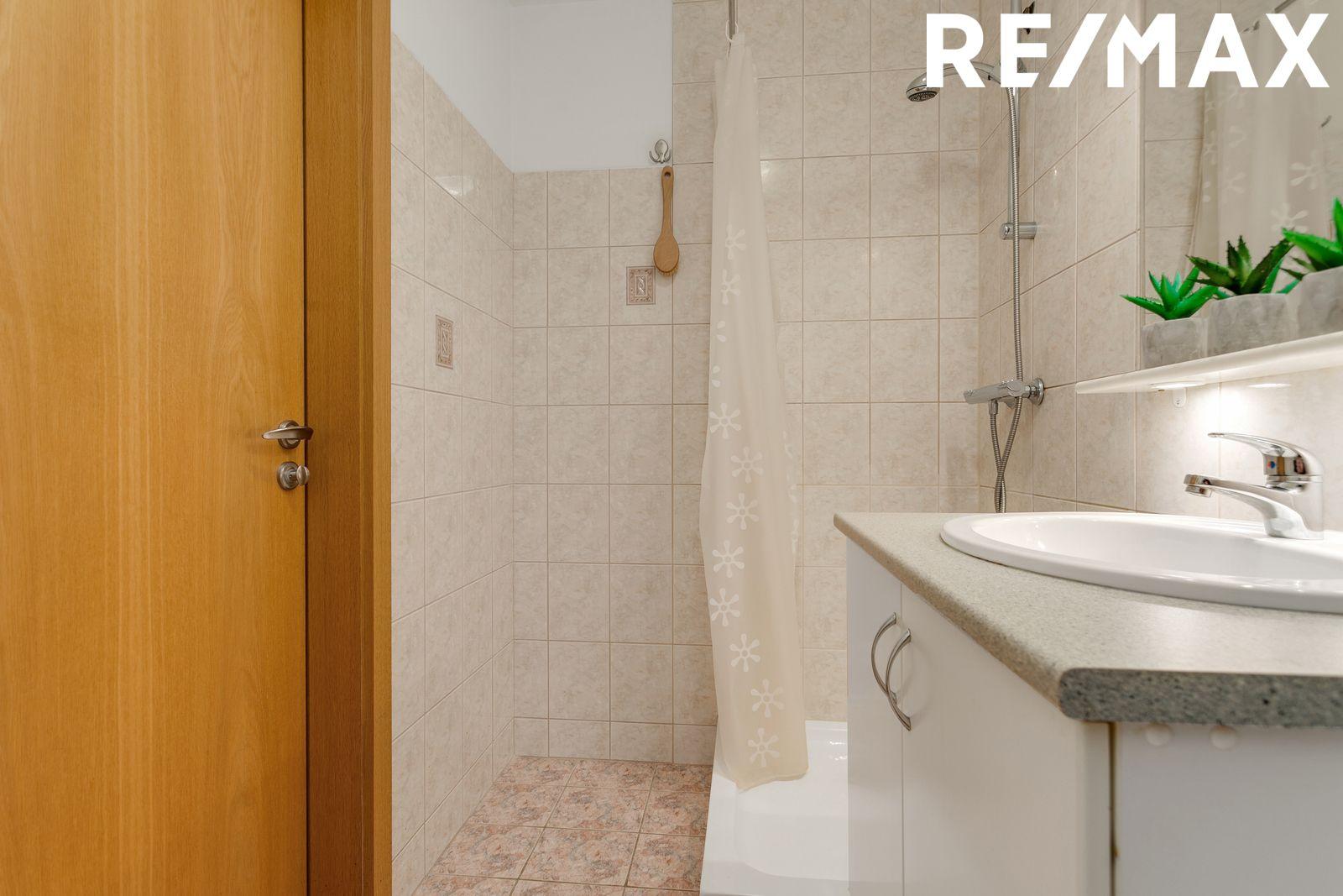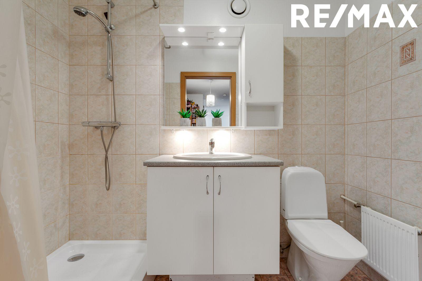 Baðherbergi er flísalagt í hólf og gólf. Sturtuklefi með hengi, innrétting, klósett og skápur.