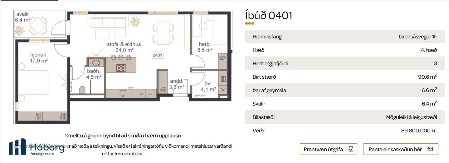 Háborg fasteignasala ehf, Jórunn lögg.fasteignasali og Kristín Rós lögg. fasteignasali kynna Grensásvegur 1F, nýbygging. Eign á 4.hæð, stærð 90,6 fm, í 108 Reykjavík. Glæsileg 3ja herbergja íbúð með fallega innréttuðu alrými, eldhús með eyju sem hægt er að sitja við og gengið út á suð-vestur svalir úr stofu, sem snýr að inngarði. Stofa er rúmgóð og björt með gólfsíðum gluggum. Hjónaherbergið er einnig með gólfsíðum gluggum, það er mjög rúmgott og með góðum skápum. Barnaherbergið er bjart, einnig með gólfsíðum gluggum og góðum fataskápum. Baðherbergið er flísalagt að hluta, með sturtu sem gengið er beint inní, óbein lýsing fyrir ofan sturtu, skúffu innrétting undir handlaug og spegill fyrir ofan handlaug einnig með óbeinni lýsingu. Sér þvottahús innan íbúðar með góðri vinnuaðstöðu með skolvaski. Eigninni fylgir geymsla í kjallara að stærð 6,6 fm. Aðgengi að bílakjallara á 3.hæðum.