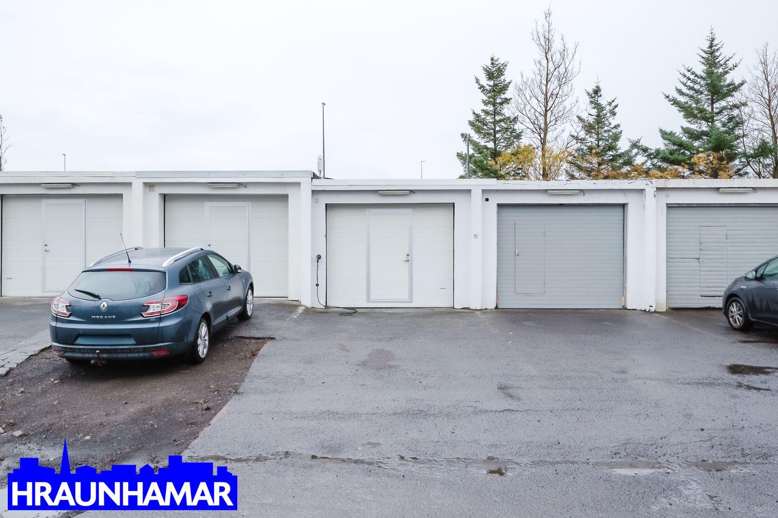 Bílskúr er 24,1 fm, upphitaður með heitu og köldu vatni. Flísalagt gólf með innréttingu innst í rýminu.