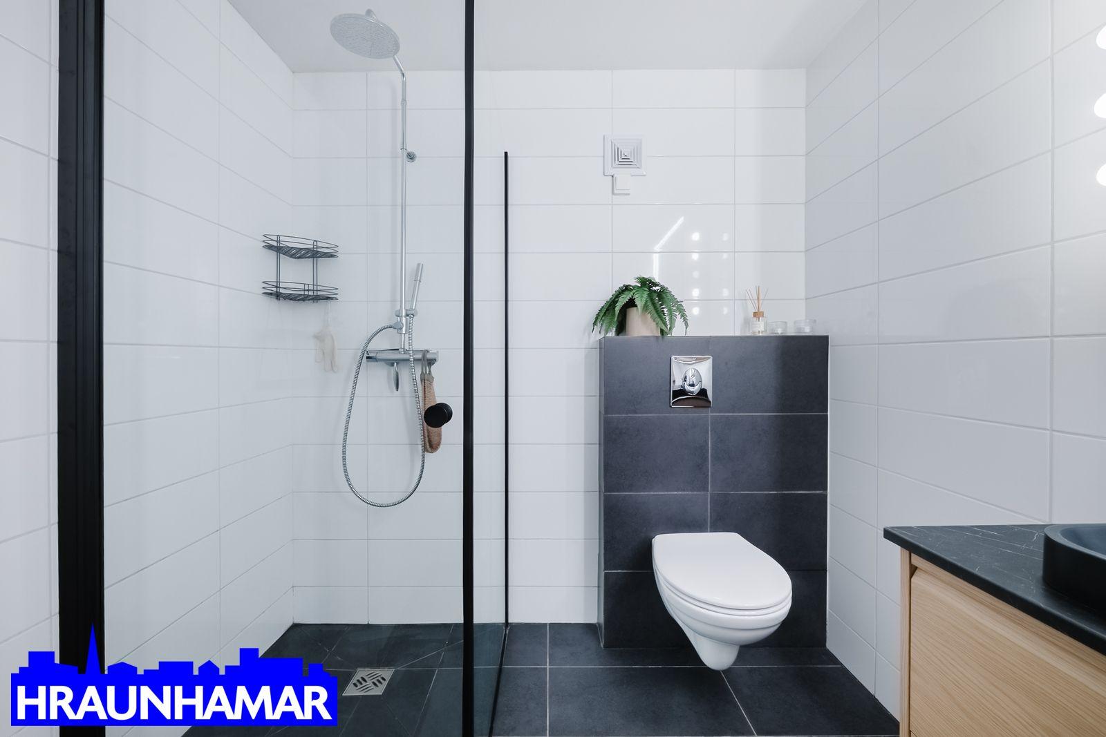 Baðherbergi er flísalagt í hólf og gólf. Upphengt klósett ásamt sturtu, handlaug og veggskápum. Nýleg dæla á baðherbergi.