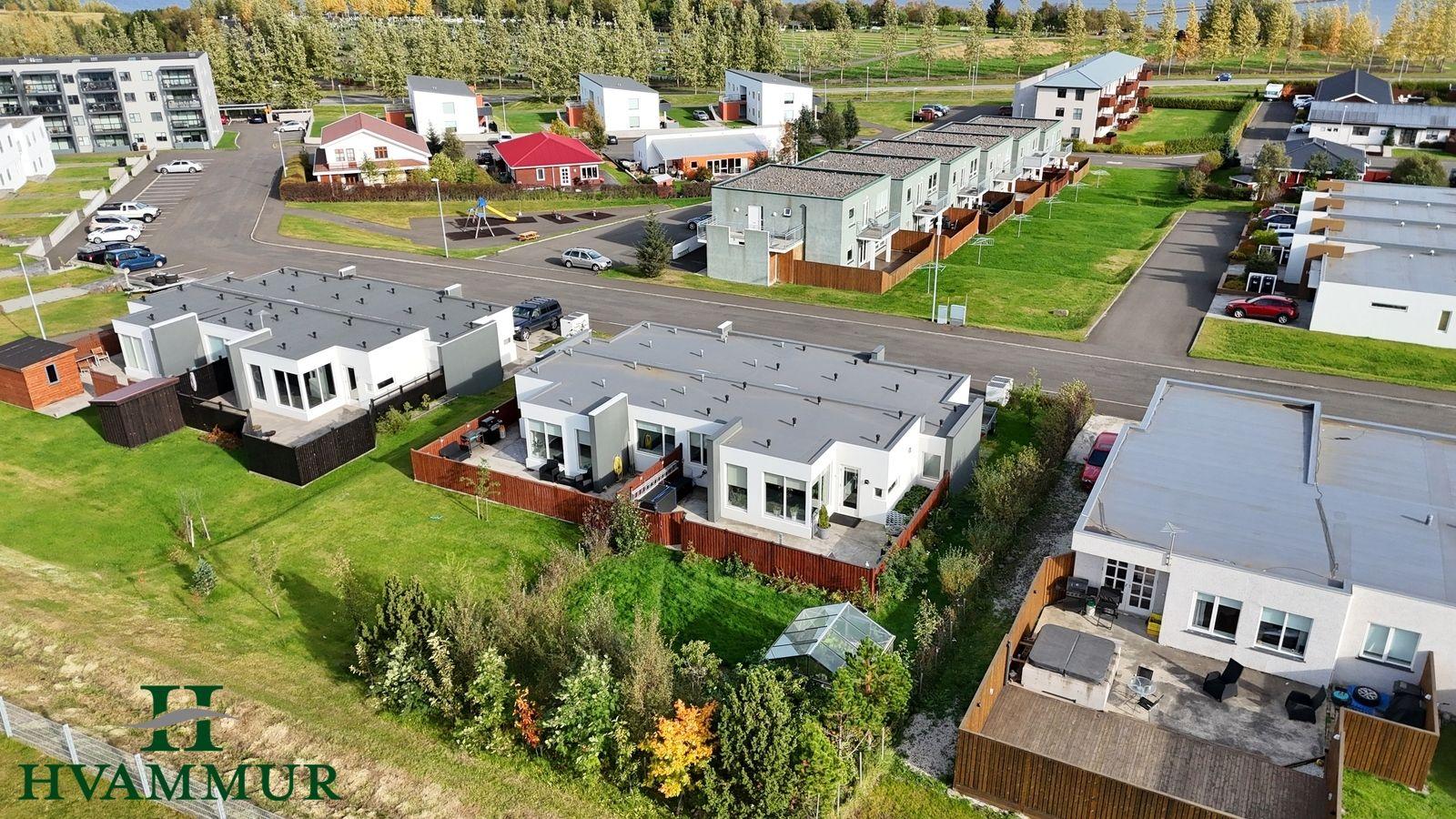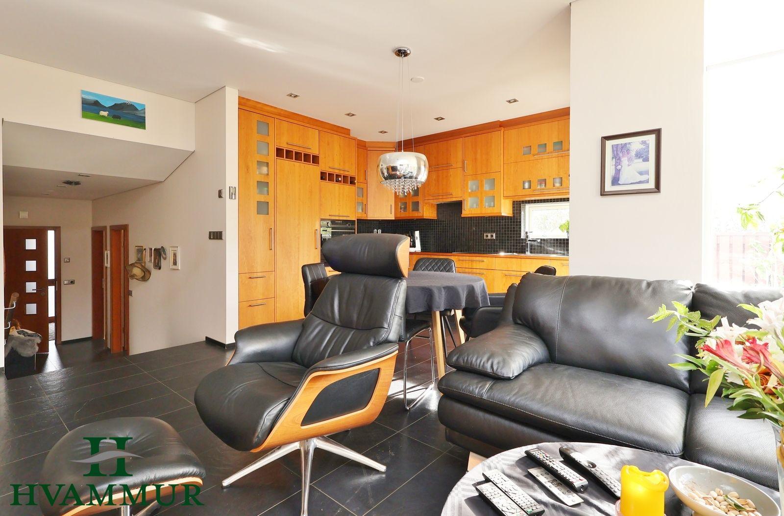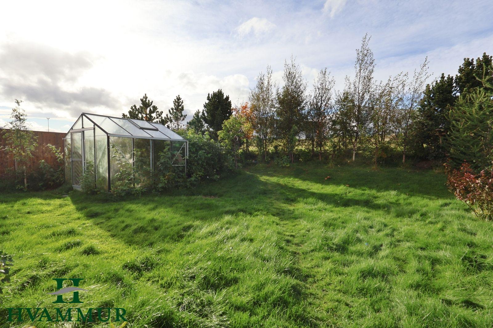 Forstofa er með flísum á gólfi og góðum fataskáp og skúffueiningu. Eldhús er með vandaðri innréttingu með dökkum flísum á milli skápa. Ísskápur og uppþvottavél í innréttingu fylgja með við sölu. Úr eldhúsi er hurð út á rúmgóða steypta verönd með timbur skjólveggjum. Stofan er með flísum á gólfi og þar er spónlögð sjónvarpsinnrétting og skápur sem fylgir með við sölu. Svefnherbergin eru tvö, bæði með flísum á gólfi og spónlögðum fataskápum. Baðherbergi er rúmgott og flísalagt bæði gólf og veggir, spónlögð innrétting, upphengt wc, baðkar og sturta, handklæðaofn og opnanlegur gluggi. Geymsla nýtist í dag sem vinnuherbergi en getur nýst sem svefnherbergi. Þar eru flísar á gólfi, fataskápur og þakgluggi með rafmagnsopnun. Bílskúr er með flísum á gólfi og þar er góð spónlögð þvottahúsinnrétting með vaska og stæði fyrir bæði þvottavél og þurrkara. Gönguhurð er við hliðina á innkeyrsluhurð sem er með rafdrifnum opnara. Lóðin er snyrtileg og framan við húsið eru tvö steypt bílastæði með snjóbræðslu í, lokað kerfi. Bak við húsið er steypt verönd með skjólveggjum, góð grasflöt, runna- og trjágróður og gróðurhús.