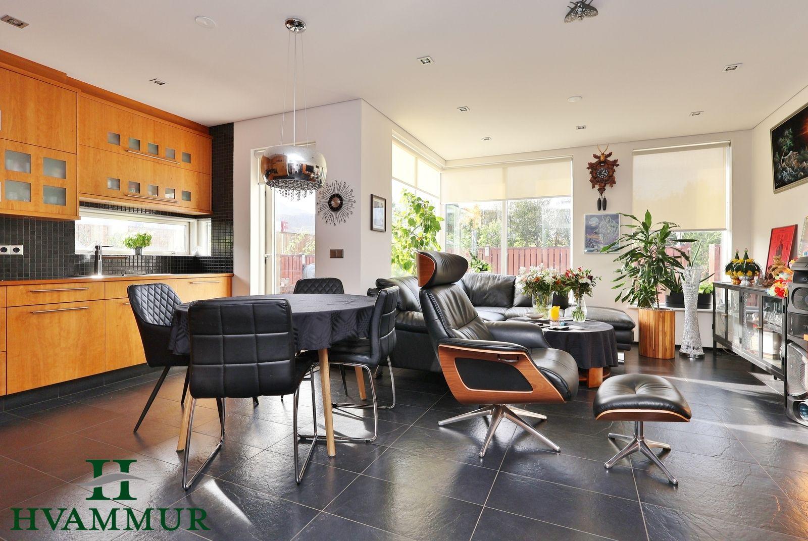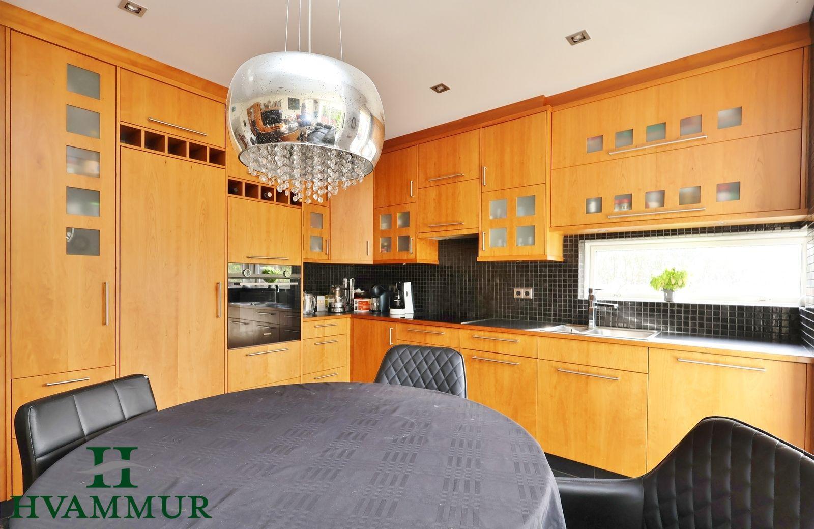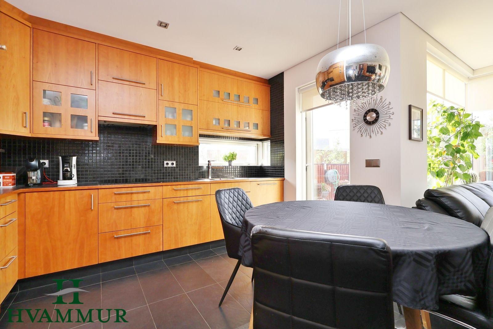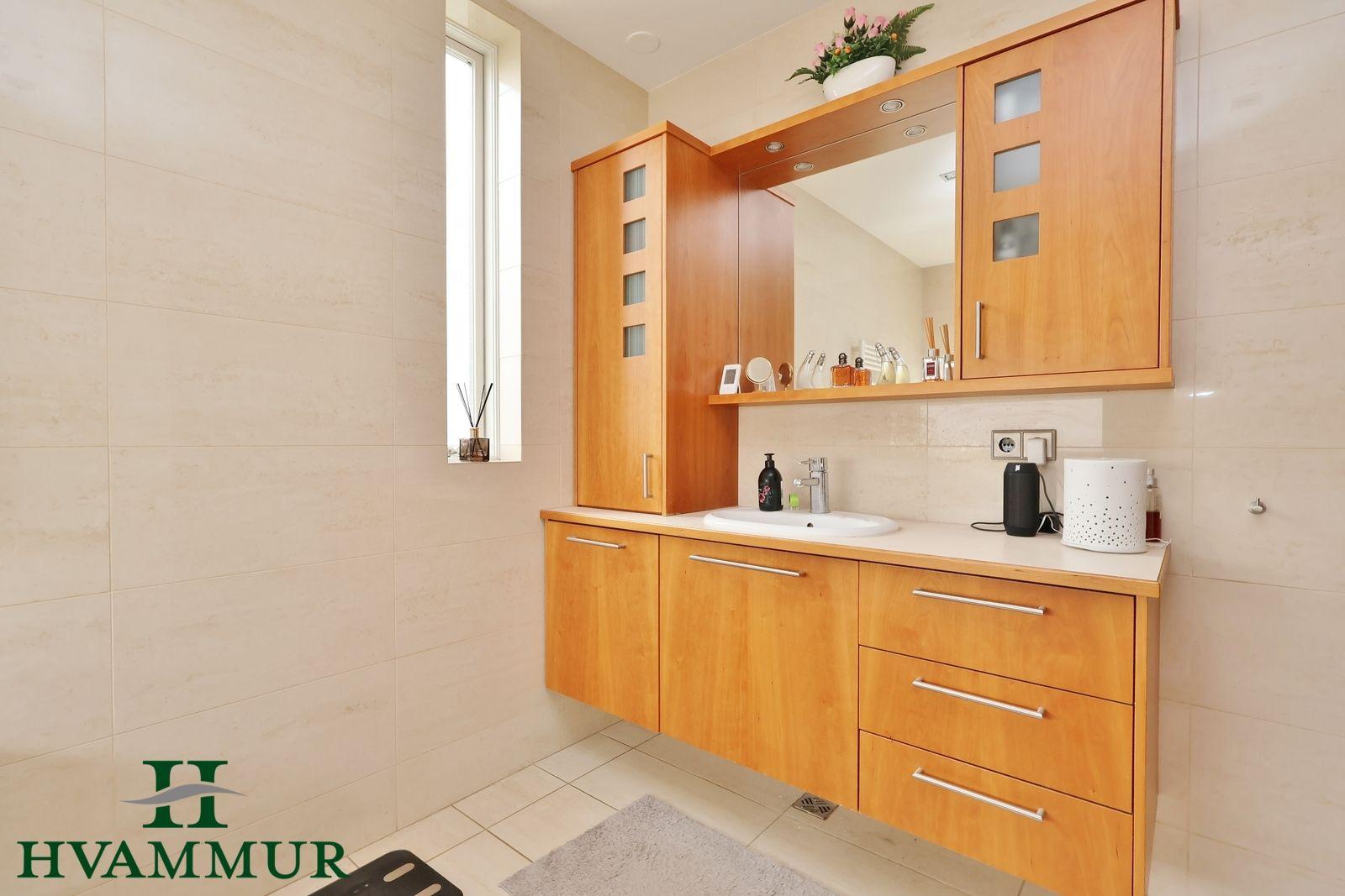 Forstofa er með flísum á gólfi og góðum fataskáp og skúffueiningu. Eldhús er með vandaðri innréttingu með dökkum flísum á milli skápa. Ísskápur og uppþvottavél í innréttingu fylgja með við sölu. Úr eldhúsi er hurð út á rúmgóða steypta verönd með timbur skjólveggjum. Stofan er með flísum á gólfi og þar er spónlögð sjónvarpsinnrétting og skápur sem fylgir með við sölu. Svefnherbergin eru tvö, bæði með flísum á gólfi og spónlögðum fataskápum. Baðherbergi er rúmgott og flísalagt bæði gólf og veggir, spónlögð innrétting, upphengt wc, baðkar og sturta, handklæðaofn og opnanlegur gluggi. Geymsla nýtist í dag sem vinnuherbergi en getur nýst sem svefnherbergi. Þar eru flísar á gólfi, fataskápur og þakgluggi með rafmagnsopnun. Bílskúr er með flísum á gólfi og þar er góð spónlögð þvottahúsinnrétting með vaska og stæði fyrir bæði þvottavél og þurrkara. Gönguhurð er við hliðina á innkeyrsluhurð sem er með rafdrifnum opnara. Lóðin er snyrtileg og framan við húsið eru tvö steypt bílastæði með snjóbræðslu í, lokað kerfi. Bak við húsið er steypt verönd með skjólveggjum, góð grasflöt, runna- og trjágróður og gróðurhús.