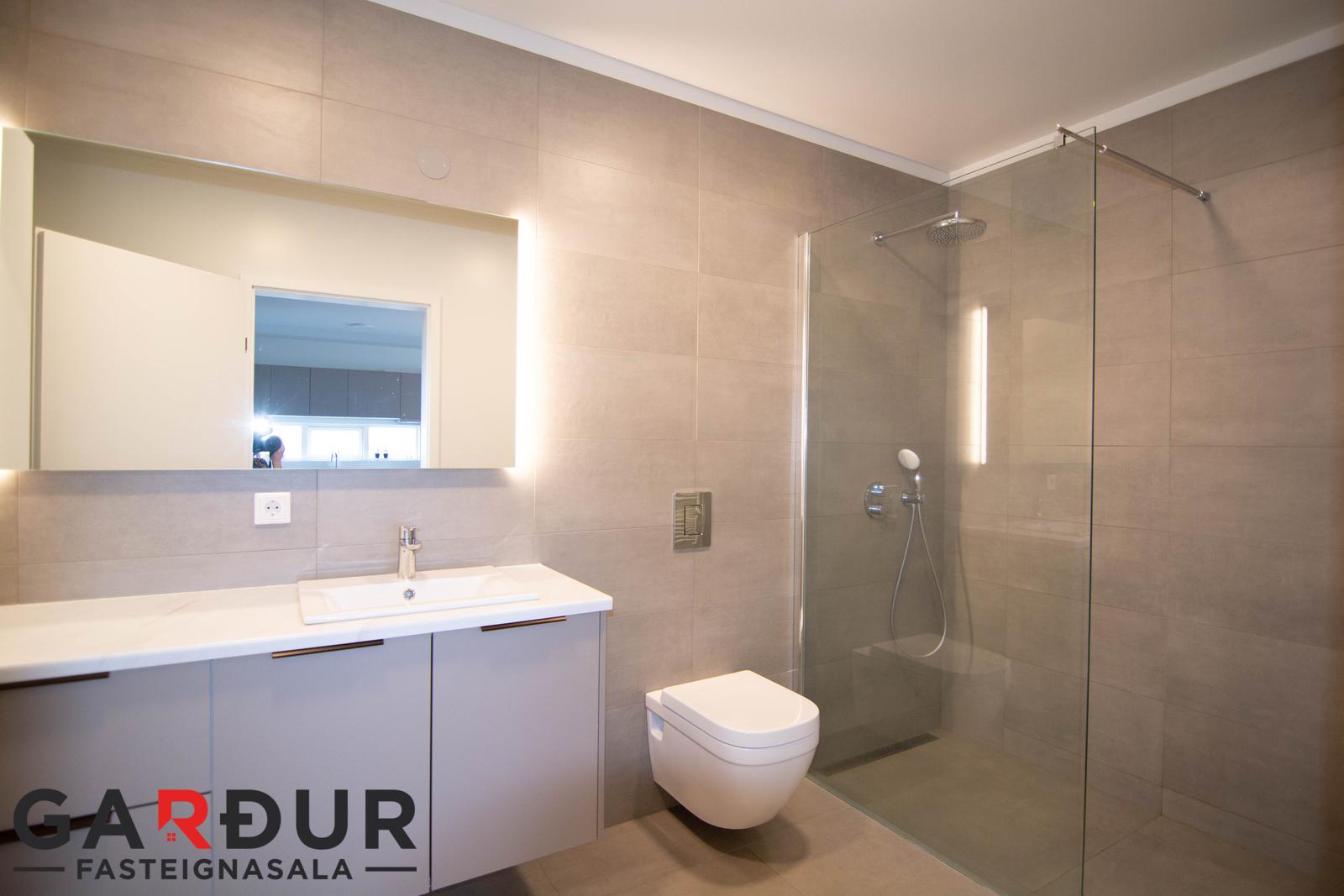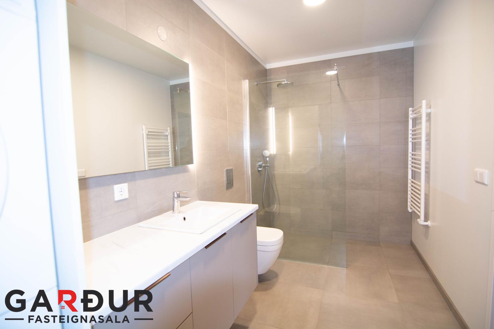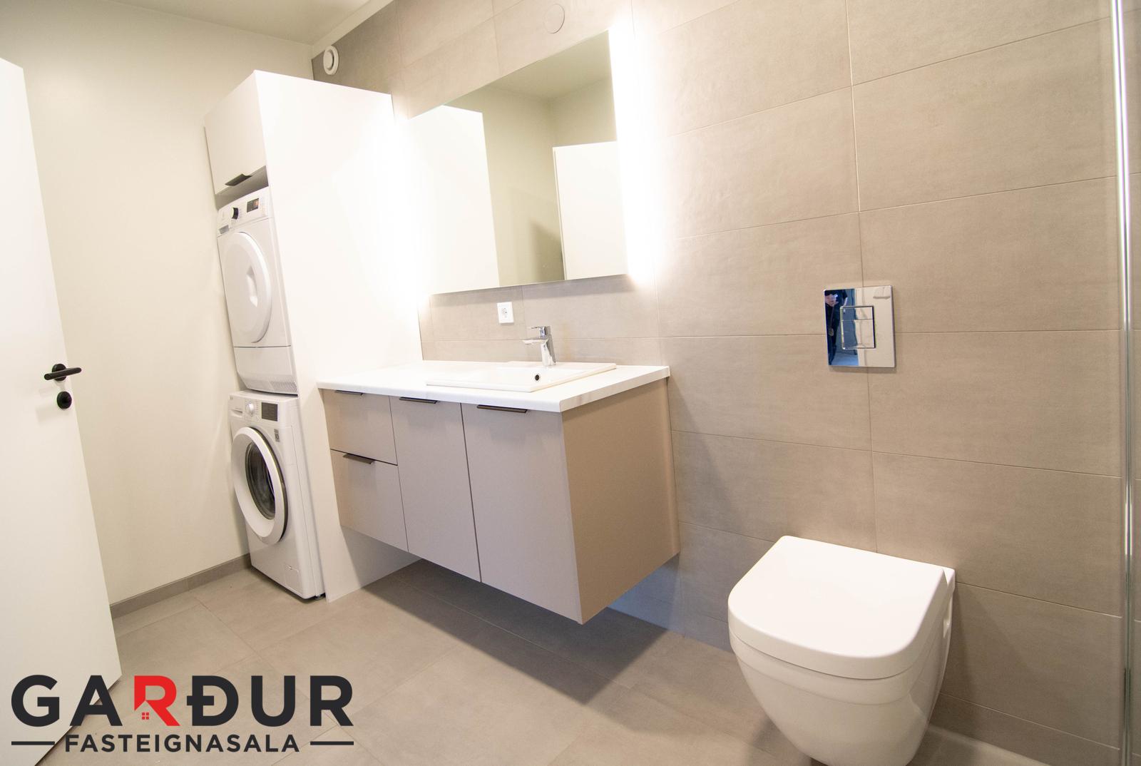 Baðherbergi með walk-in sturtu, innrétting með handlaug, handklæðaofn og stæði fyrir þvottavél og þurrkara.