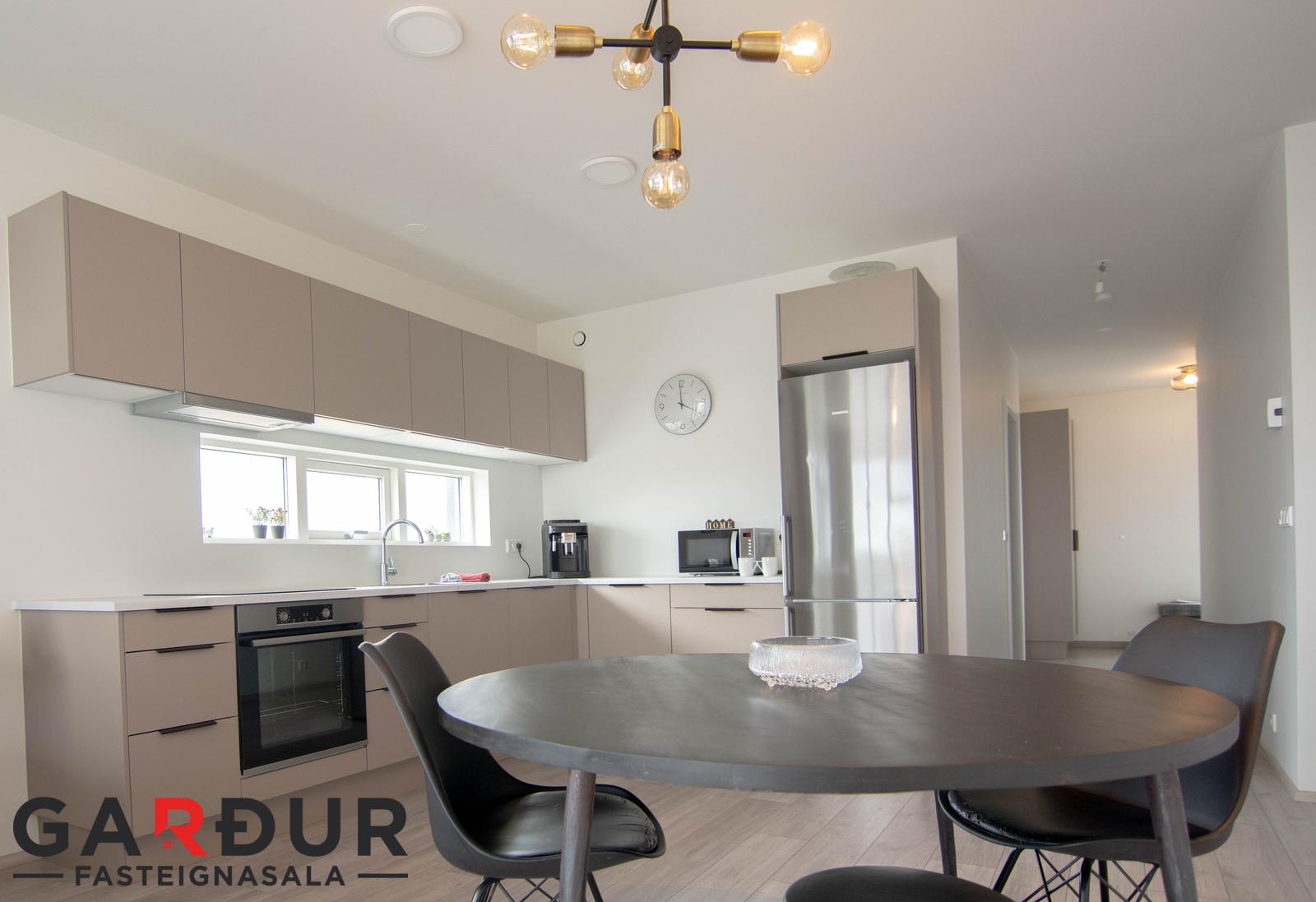 Samkvæmt seljanda:Innréttingar og skápar eru frá HTH Ormsson, bakarofn, keramik helluborð, eyjuháfur/veggháfur(kolasíu) frá Gorenje. Harðparketi er á gólfum fyrir utan votrými sem eru flísalögð. Gluggar eru ál-trégluggar frá Byko. Tvöfalt hefðbundið verksmiðjuframleitt K-gler.