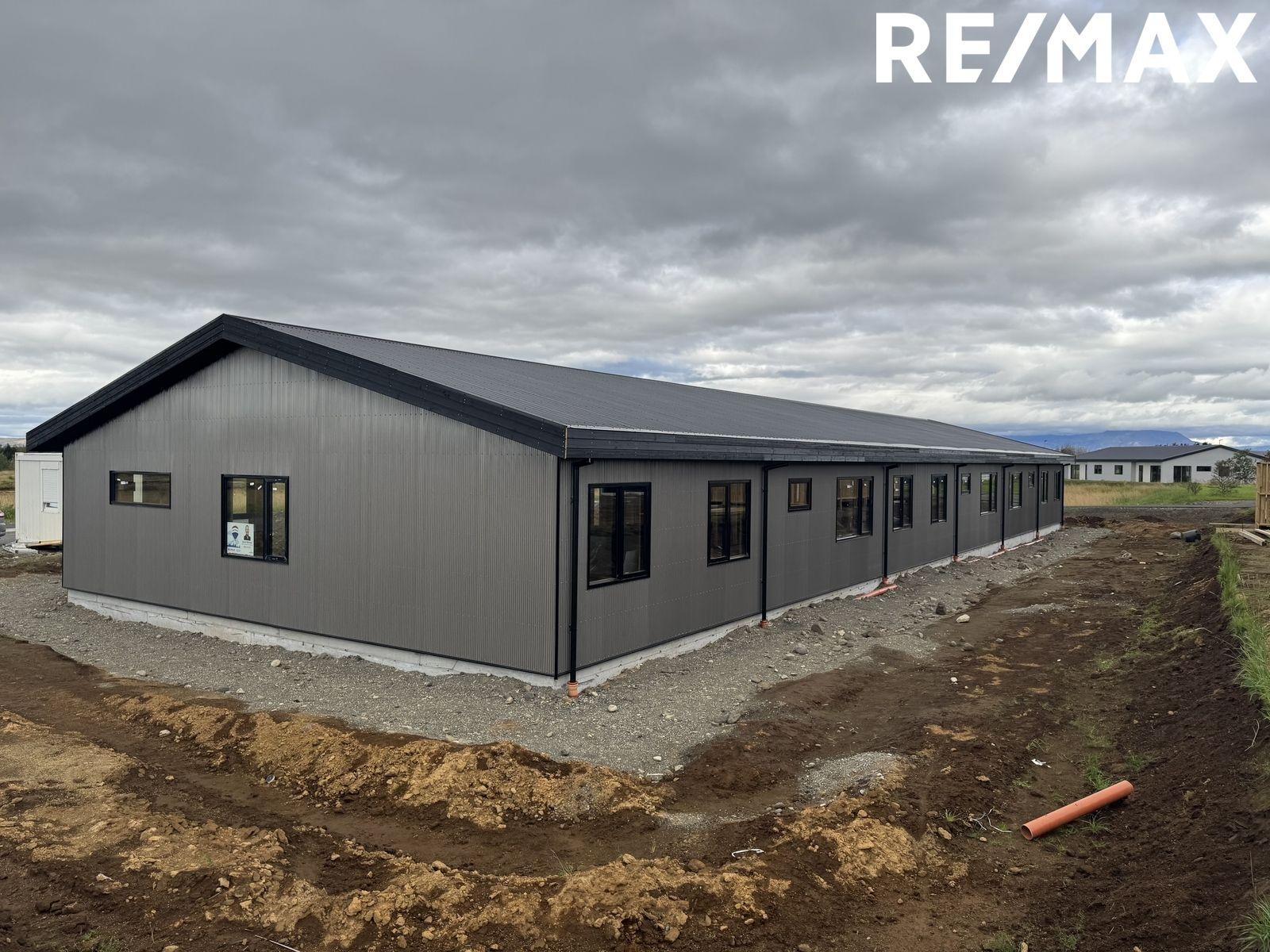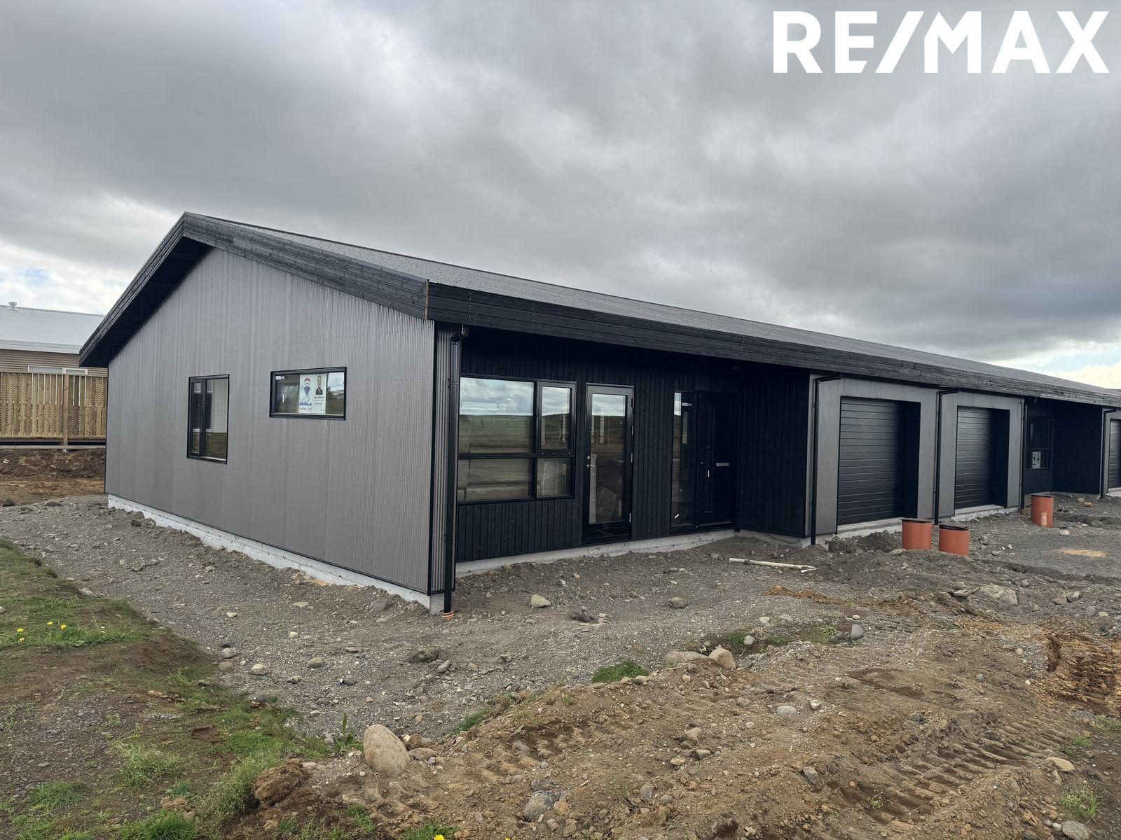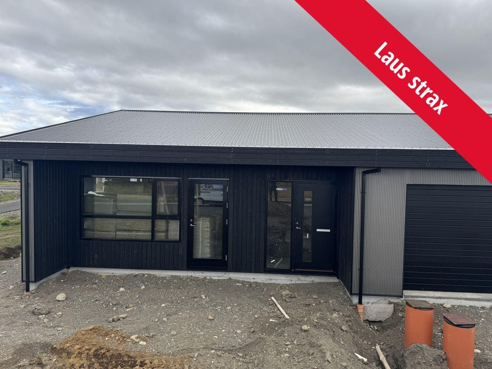 Nánari lýsing: Sökklar: Sökklar eru steyptir og einangraðir að innan. Gólfplata: Gólfplata er steypt og einangruð með gólfhita í. Neysluvatnslagnir eru lagðar skv. verkfræðiteikningum, rör í rör. Útveggir: Allir útveggir hússins eru úr timburgrind. Húsið er klætt að utan með litaðri grárri smábáru frá Húsasmiðjunni, timbur inn í innskoti við innganga. Gluggar og hurðir: Allir gluggar og útihurðir eru úr ál/tré. Tvöfalt verksmiðjugler frá viðurkenndum framleiðanda er í húsinu og flyst ábyrgð þess áfram til kaupenda. Söluaðili er Gluggatækni. Litur að utan er RAL 9005 (svart) og sami litur að innan. Þak: Tvíhalla þak er á húsinu og er það lituð stálklæðning í lit RAL 9005 (svart). Þakkantur: Þakkantur er timburklæddur með svörtum lit Niðurföll og þakrennur: Þakniðurföll eru úr áli frá Hagblikk og rennur eru úr plasti frá Húsasmiðjunni. Lóð: Lóð afhendist grófjöfnuð. Afhending: Húsið skilast fokhelt.