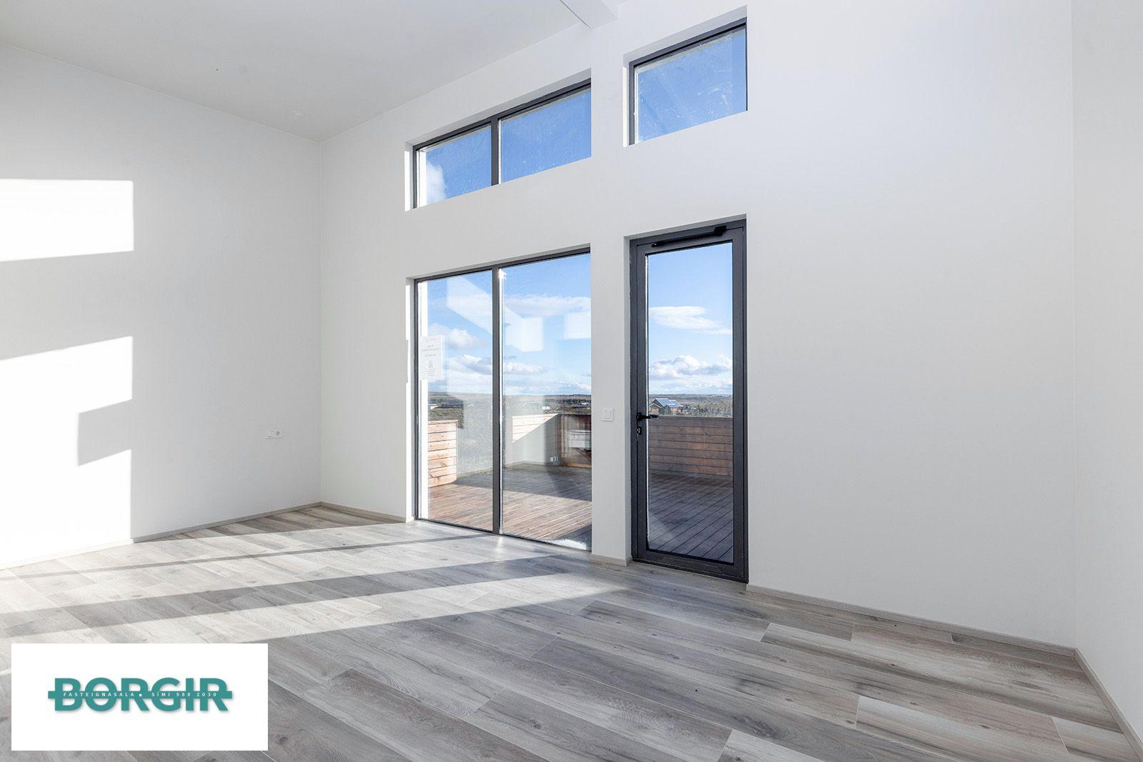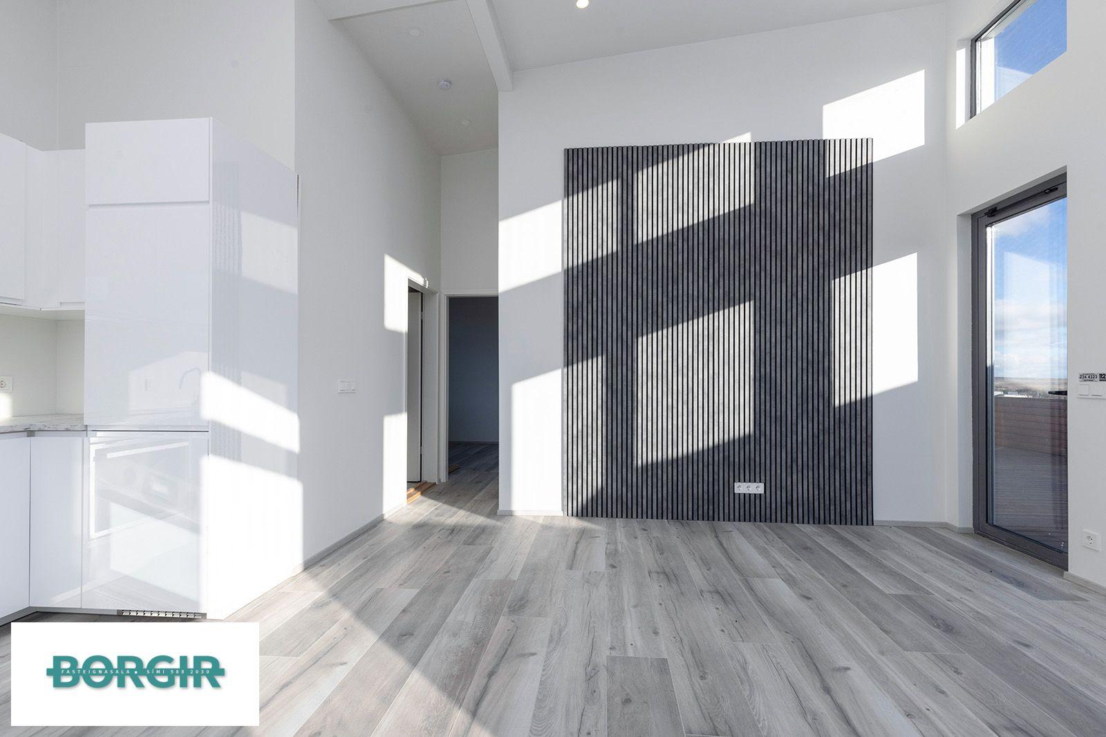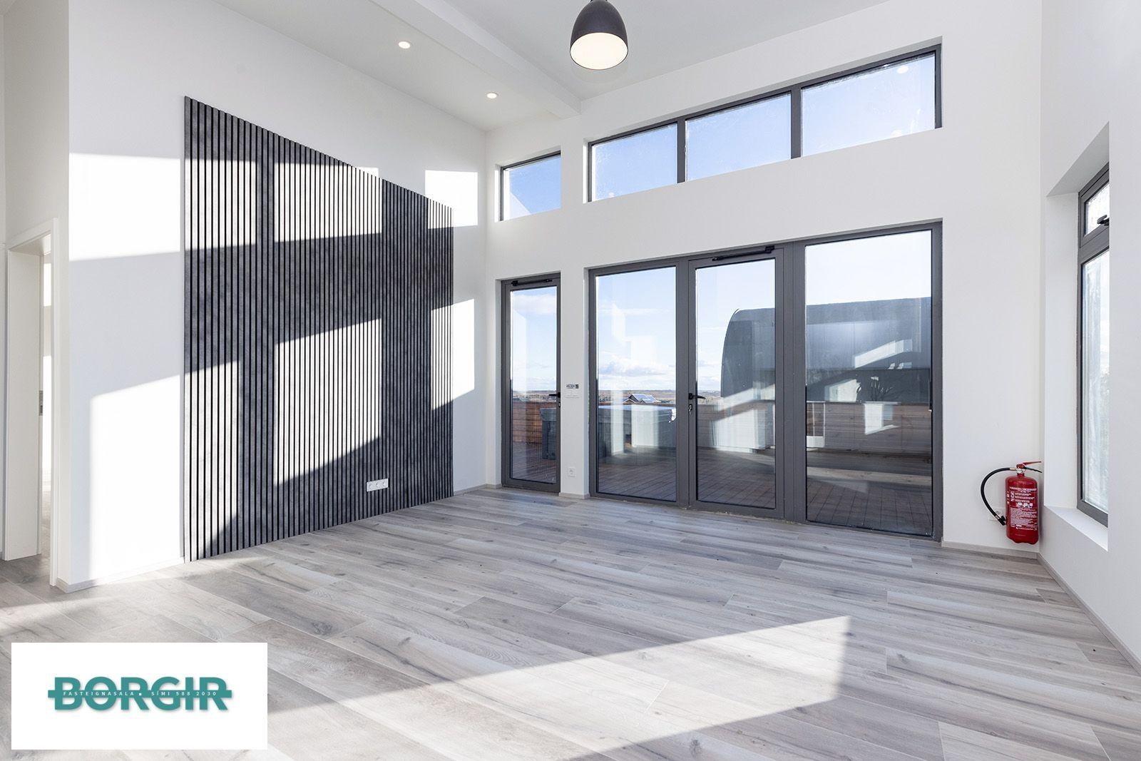 Inngangur: Gengið beint inní stofu/borðstofu með plast parketi á gólfi með gólfsíðum gluggum sem snúa til suðurs, mikilli lofthæð og fallegu útsýni.