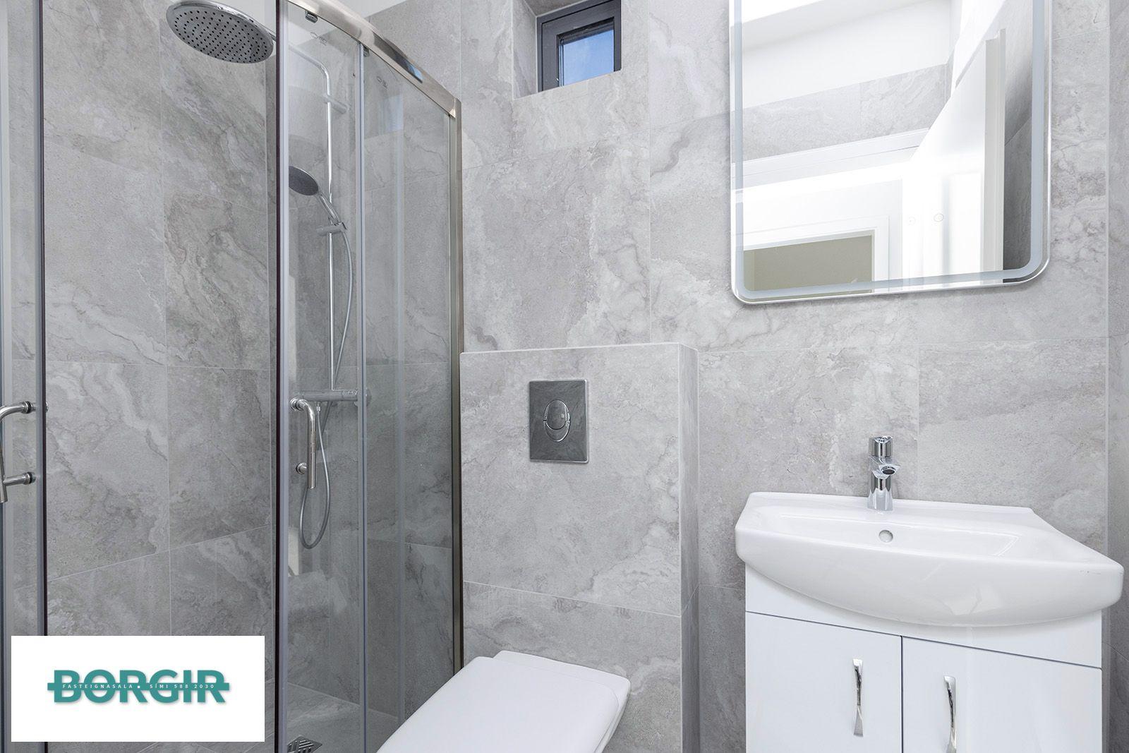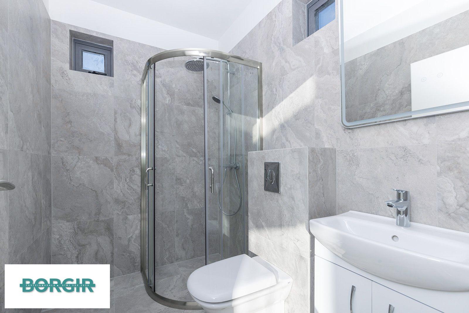 Baðherbergi: Baðinnrétting, Salernið er upphengt. Gólfið er flísalagt og veggir upp í loft, sturtuklefi.