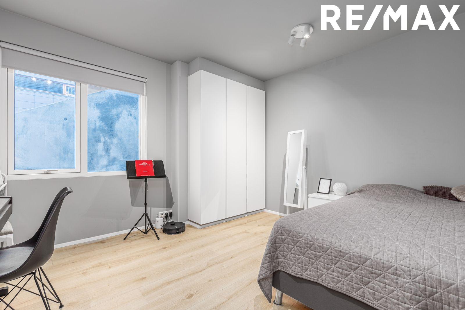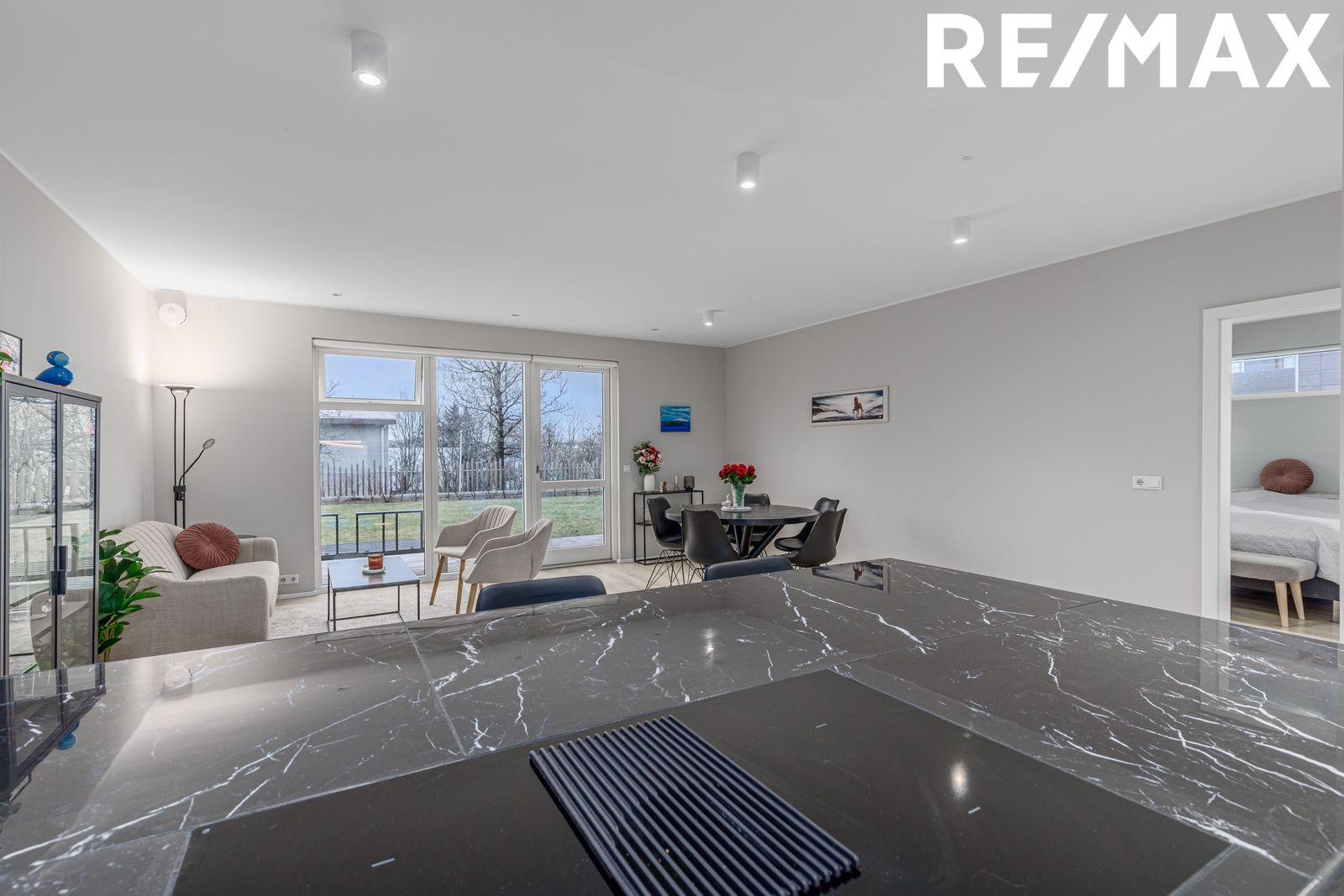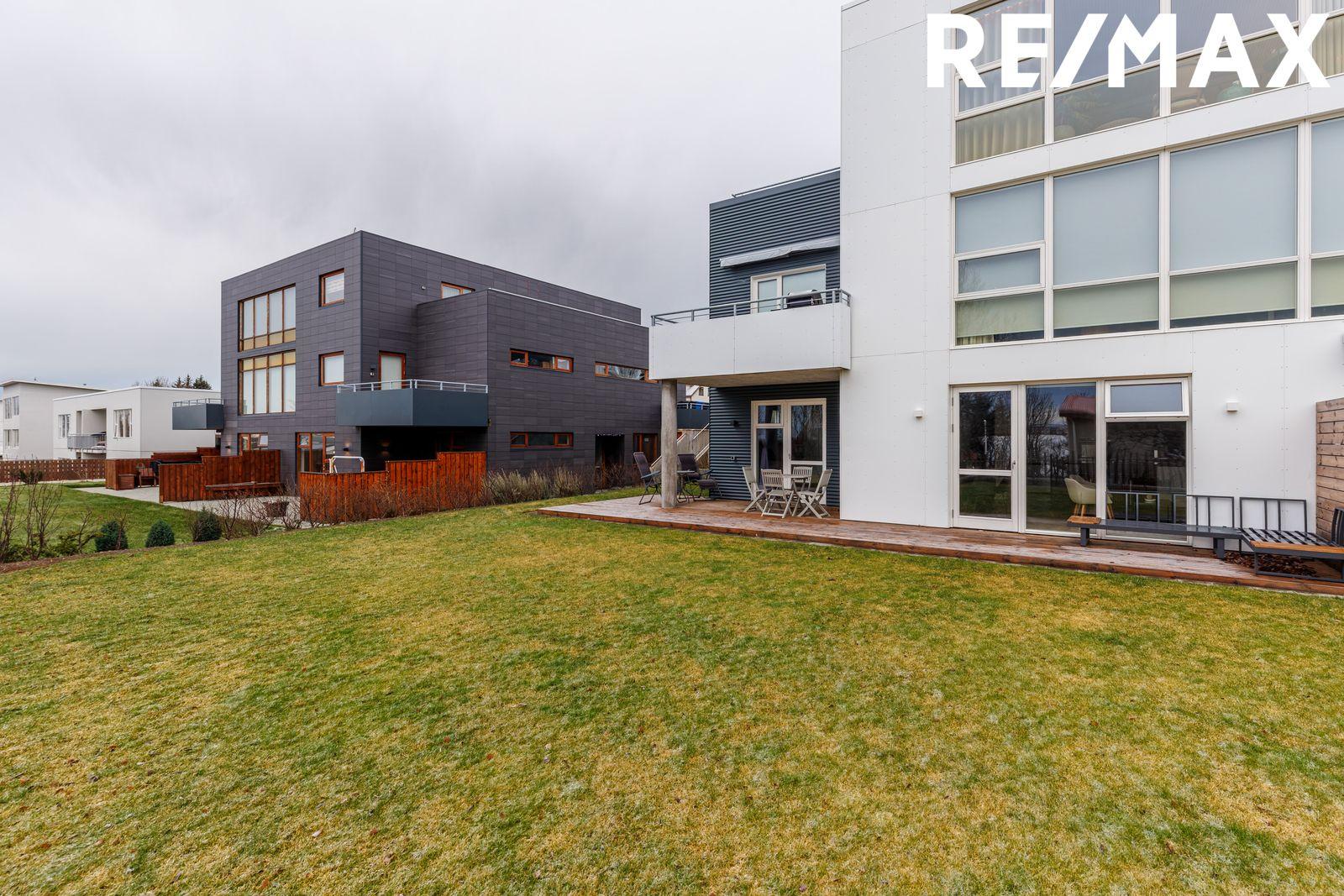 Smelltu hér til að fá söluyfirlit sent beint af vef remax.isNánari lýsing:Eldhús og stofa: eru í opnu og björtu rými með parketi á gólfi, gólfsíðum gluggum og hurð út á timburverönd sem snýr í suður. Mikið borðpláss og steinn á borðum.