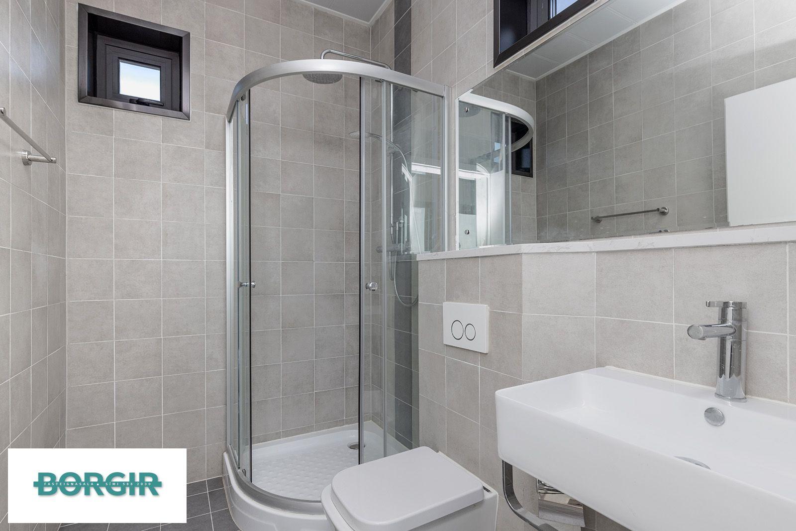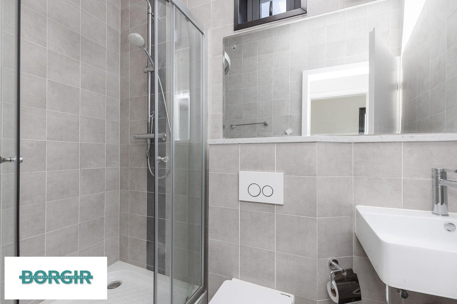 Baðherbergi: Baðinnrétting, Salernið er upphengt. Gólfið er flísalagt og veggir upp í loft, sturtuklefi.