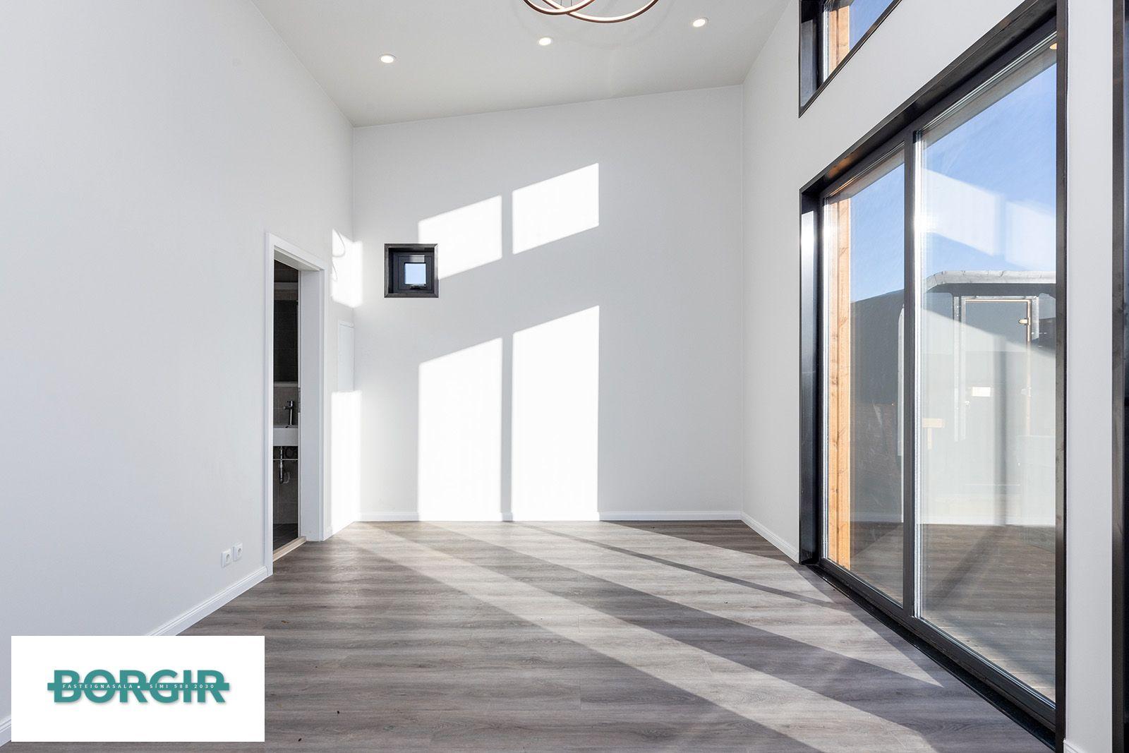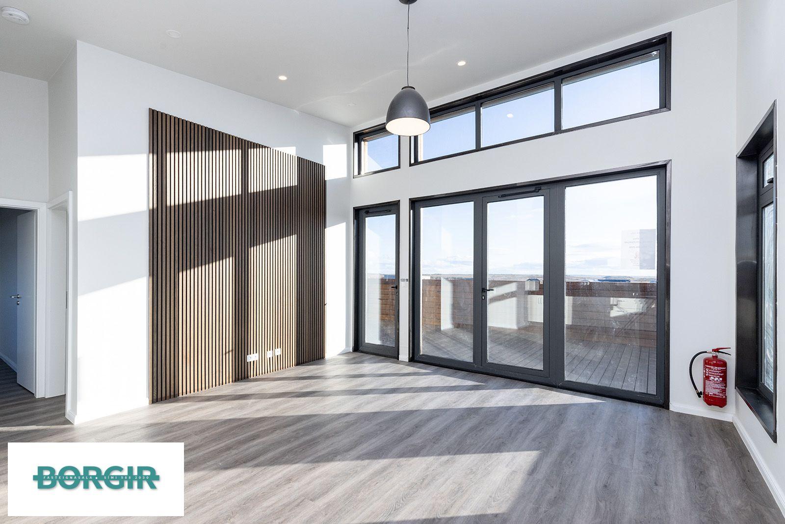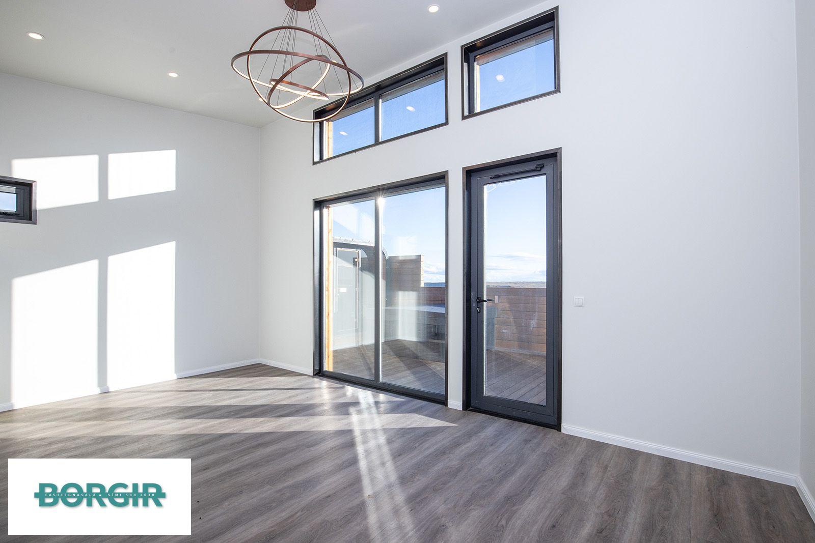 Inngangur: Gengið beint inní stofu/borðstofu með plast parketi á gólfi með gólfsíðum gluggum sem snúa til suðurs, mikilli lofthæð og fallegu útsýni.