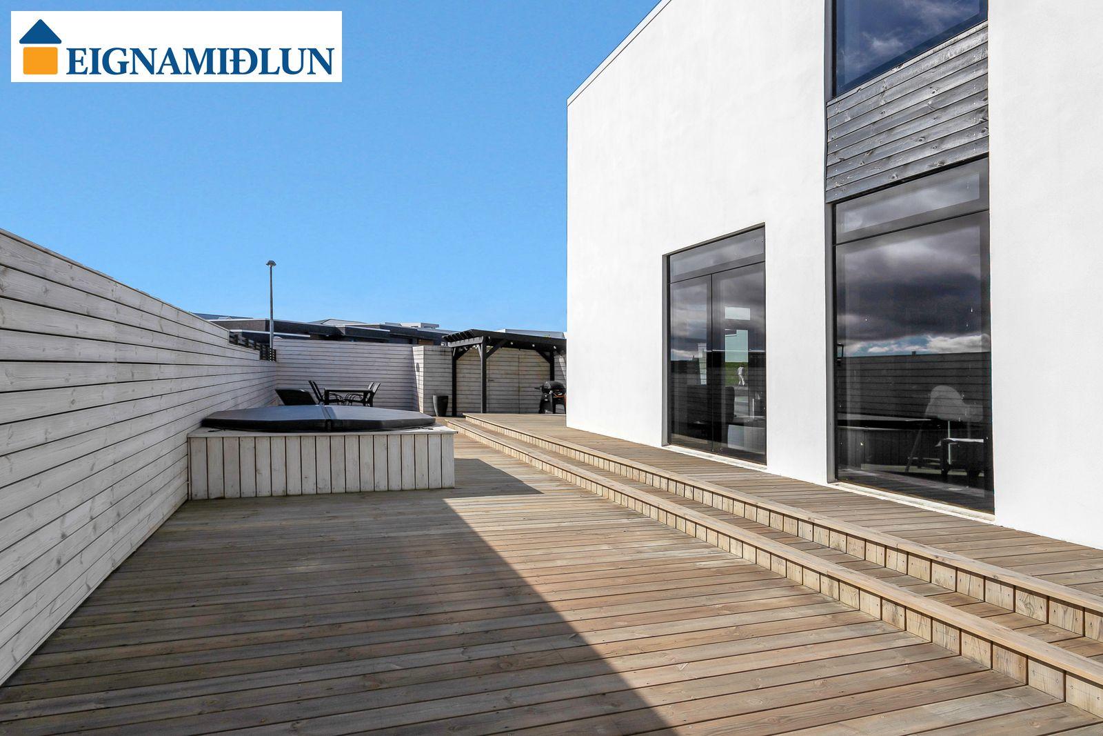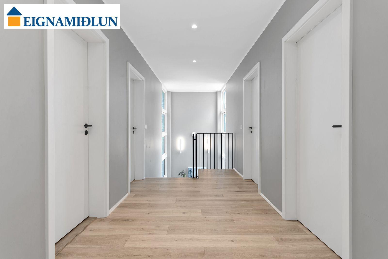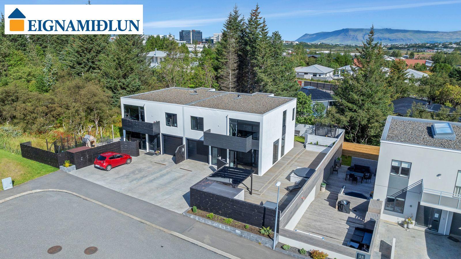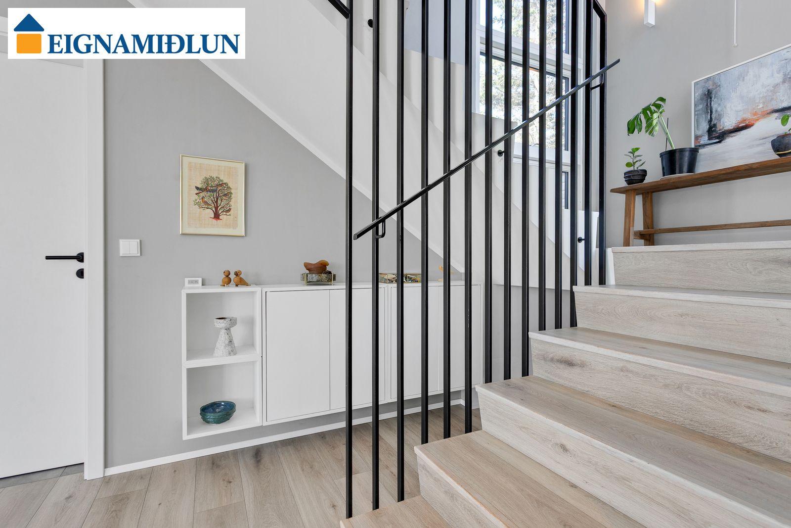 Fallegt og vel skipulagt 181m² parhús á tveimur hæðum. Fimm svefnherbergi, stór timburpallur með heitum potti. Steypt upphitað bílaplan þar sem pláss er fyrir tvo bíla, þriggja fasa rafhleðslustöð. Örstutt er í alla þjónustu, skóla, leikskóla og frábærar gönguleiðir allt í kring. Góð eign á þessum eftirsótta og fallega stað.Samkvæmt skráningu HMS er birt flatarmál eignarinnar 181m², flatarmál íbúðarrýmis er 163,3m² og flatarmál bílskúrs er 17,7m². Fyrirhugað fasteignamat 2026 kr. 148.750.000.