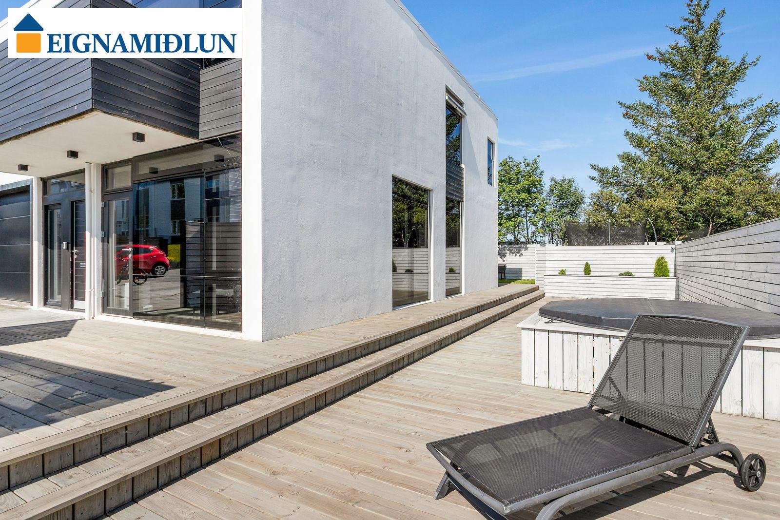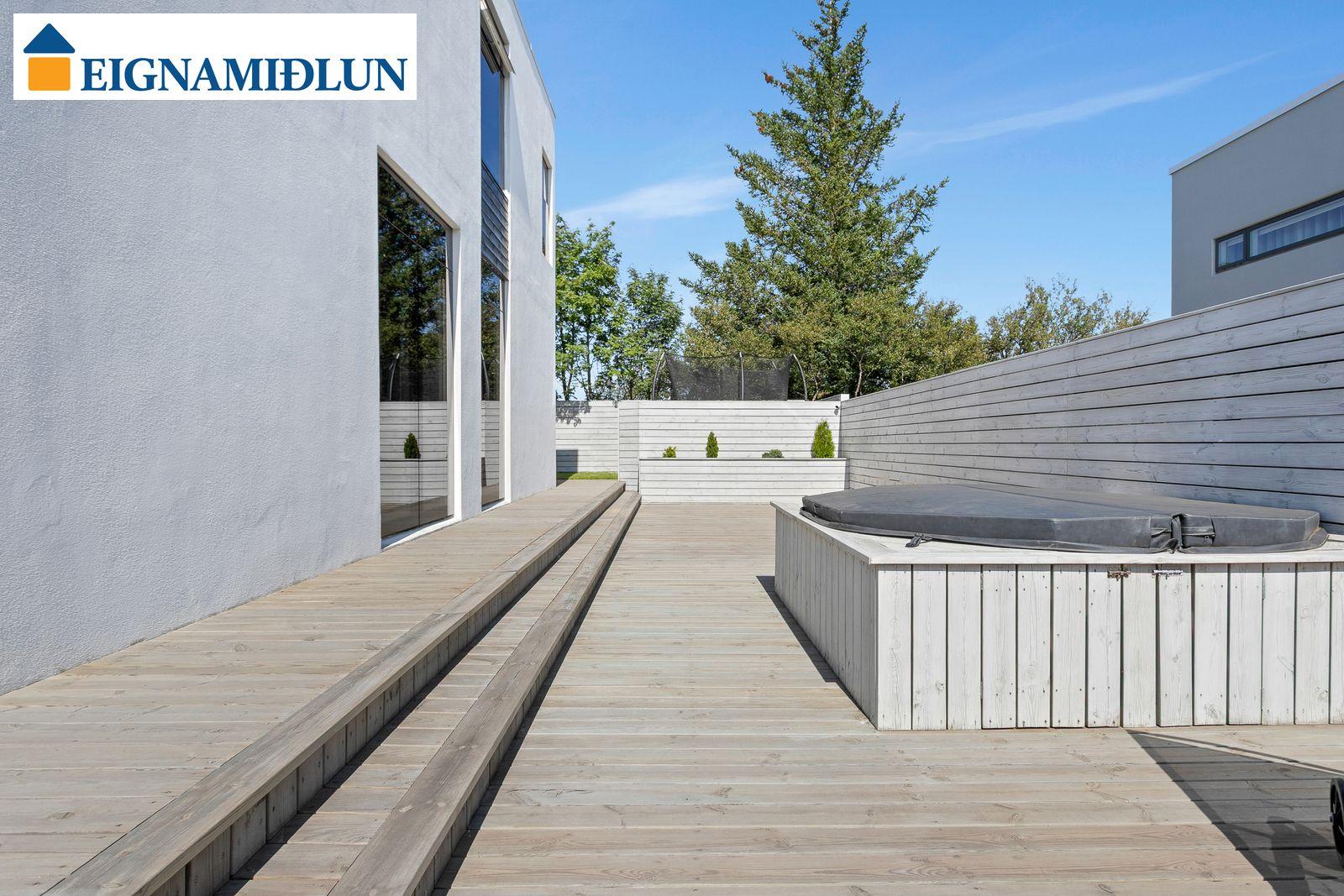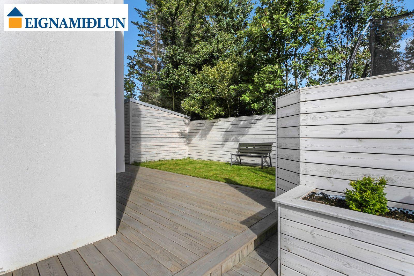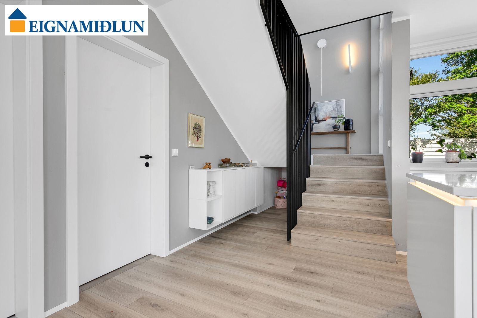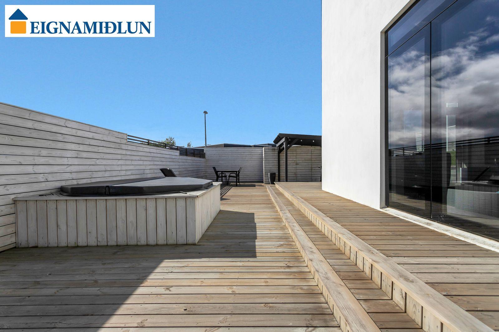 Fallegt og vel skipulagt 181m² parhús á tveimur hæðum. Fimm svefnherbergi, stór timburpallur með heitum potti. Steypt upphitað bílaplan þar sem pláss er fyrir tvo bíla, þriggja fasa rafhleðslustöð. Örstutt er í alla þjónustu, skóla, leikskóla og frábærar gönguleiðir allt í kring. Góð eign á þessum eftirsótta og fallega stað.Samkvæmt skráningu HMS er birt flatarmál eignarinnar 181m², flatarmál íbúðarrýmis er 163,3m² og flatarmál bílskúrs er 17,7m². Fyrirhugað fasteignamat 2026 kr. 148.750.000.